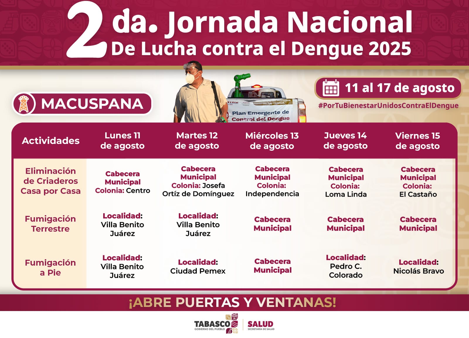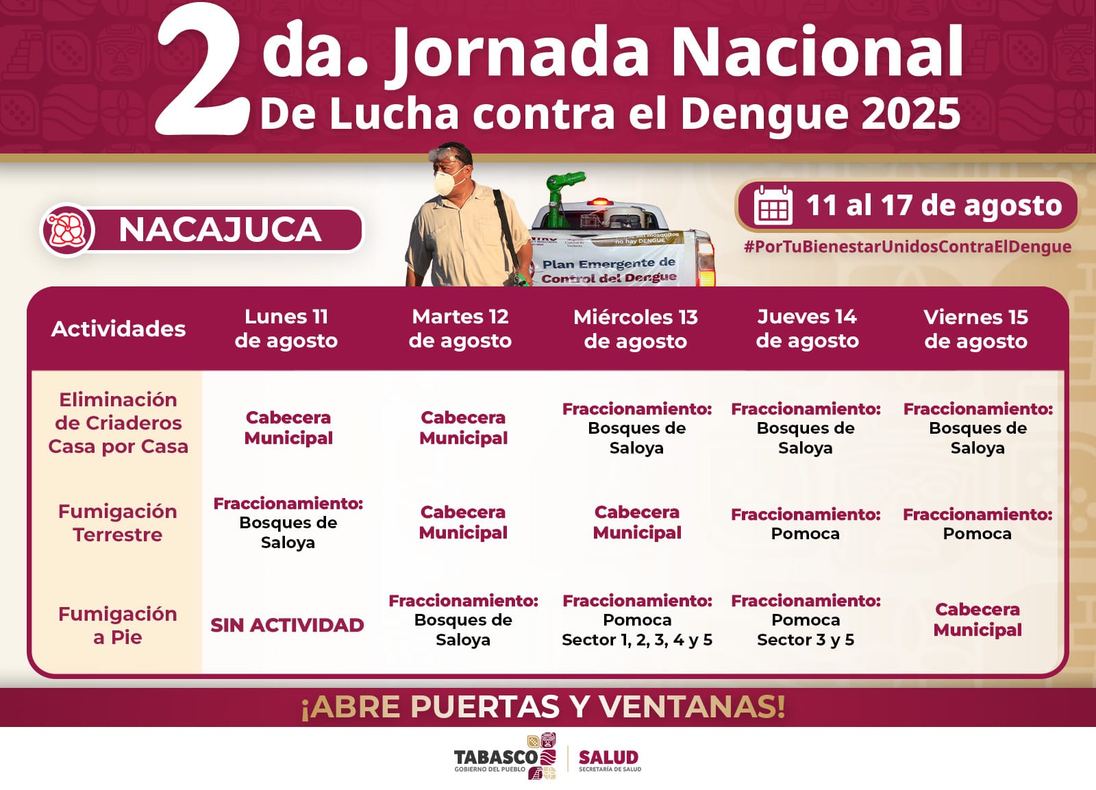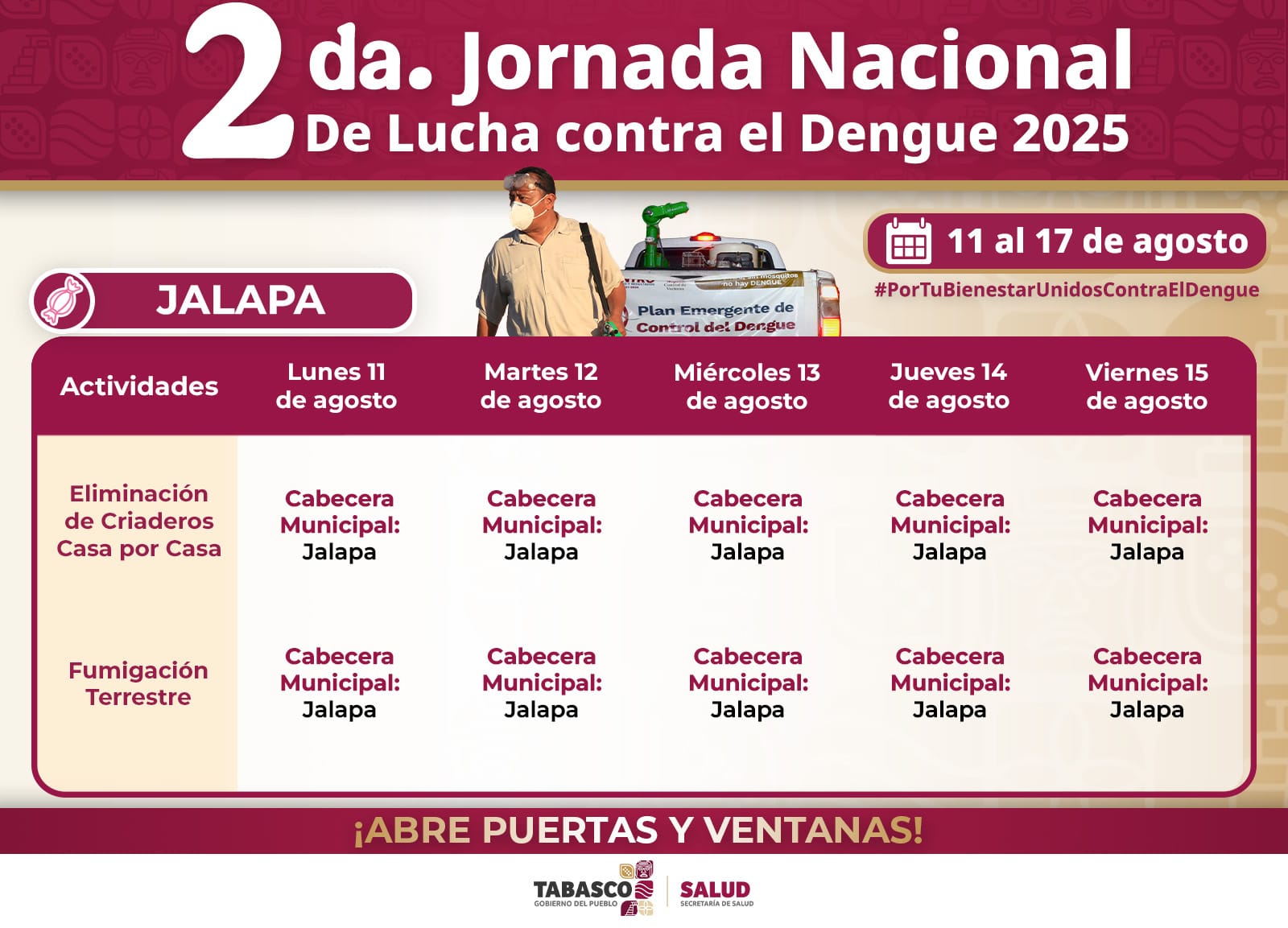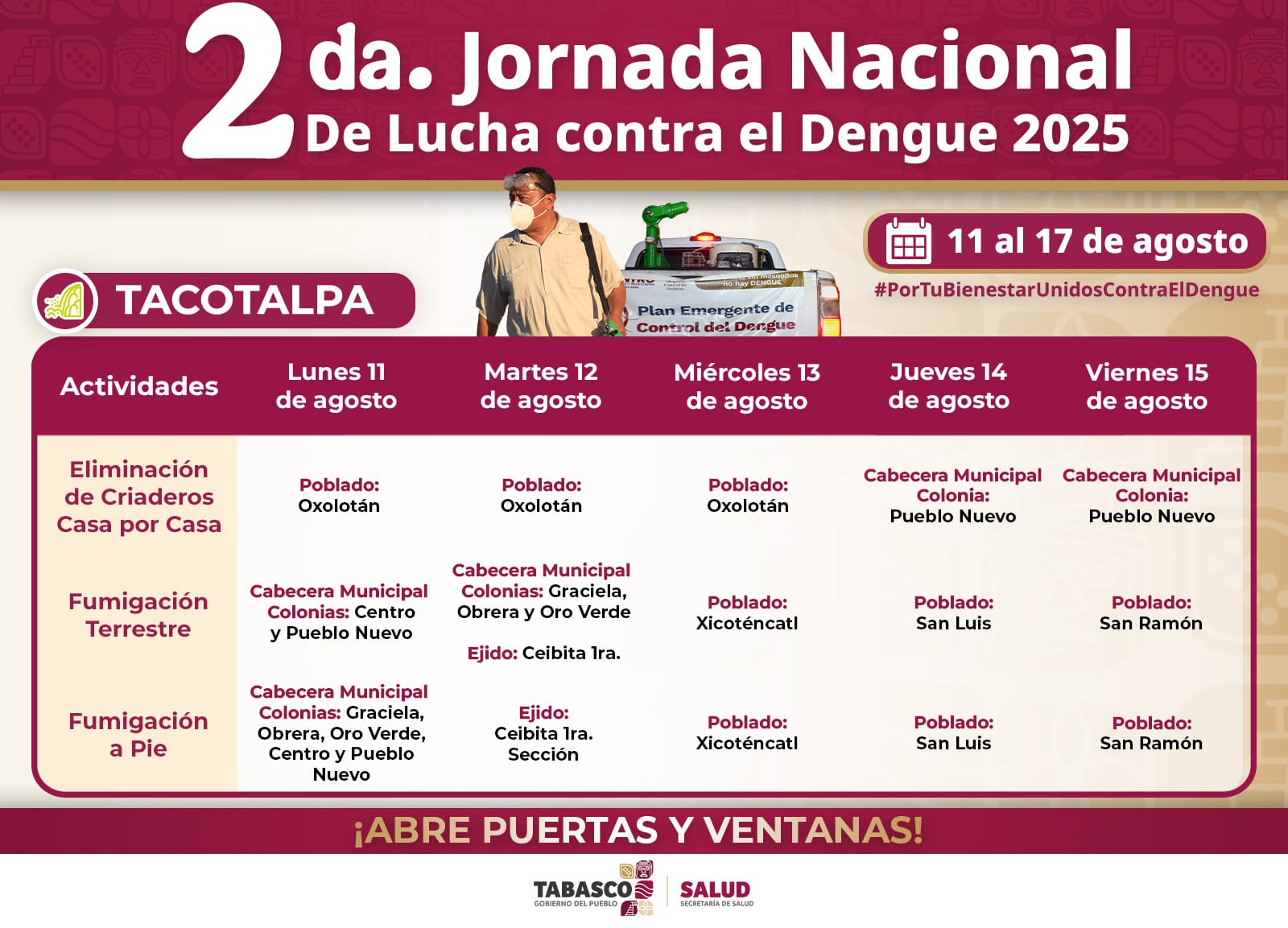 La Secretaría de Salud informa a la población tabasqueña que del 11 al 15 de Agosto, se continuarán los operativos de fumigación terrestre y eliminación de criaderos de mosquitos casa por casa en los 17 municipios del Estado.