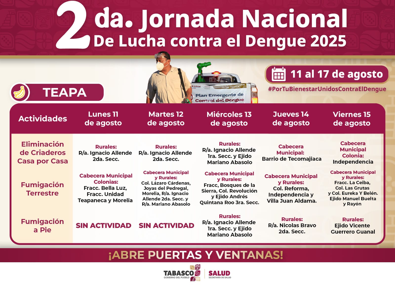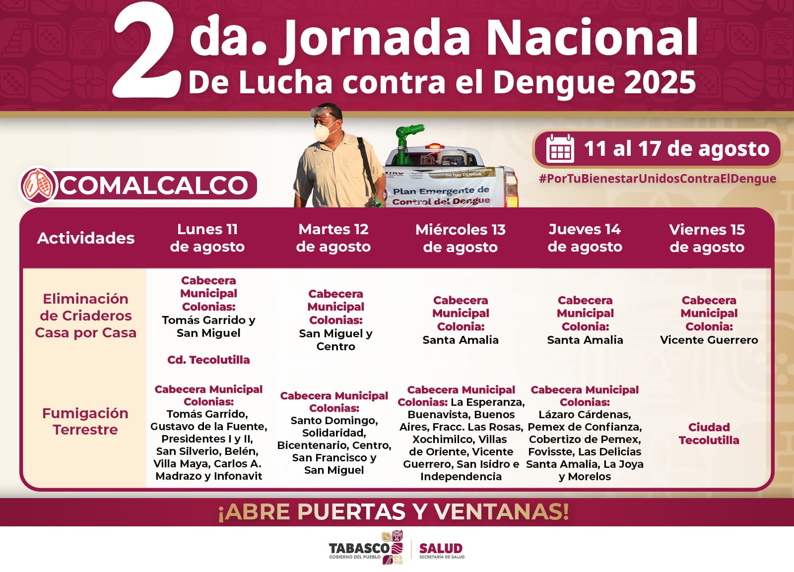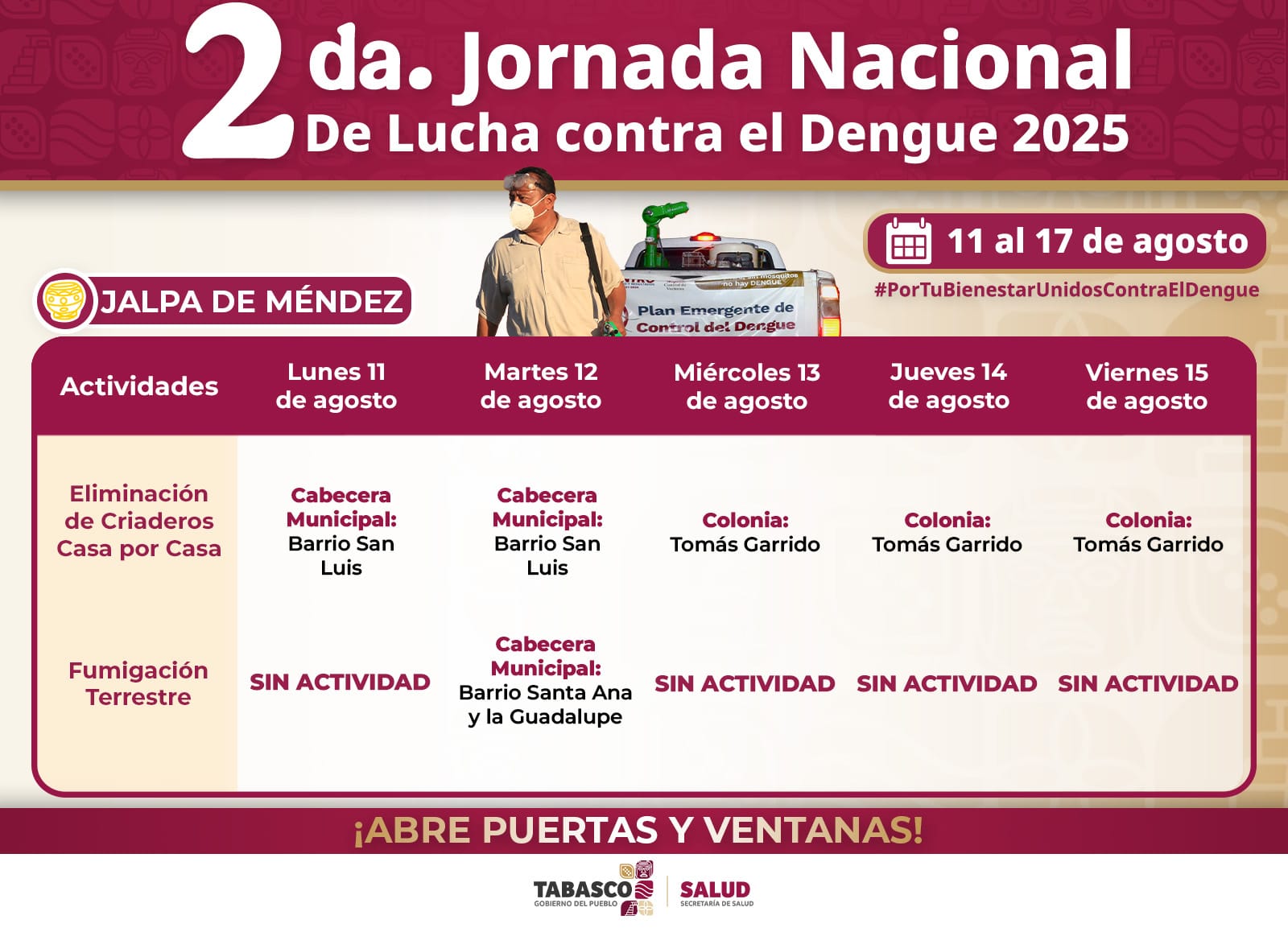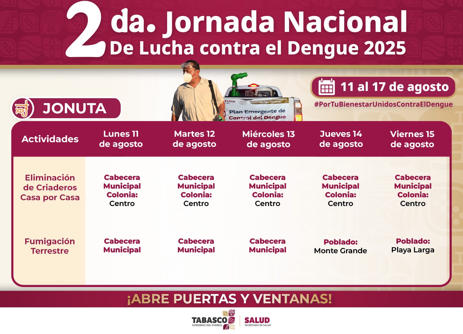 La Secretaría de Salud informa a la población tabasqueña que del 11 al 15 de Agosto, se continuarán los operativos de fumigación terrestre y eliminación de criaderos de mosquitos casa por casa en los 17 municipios del Estado.