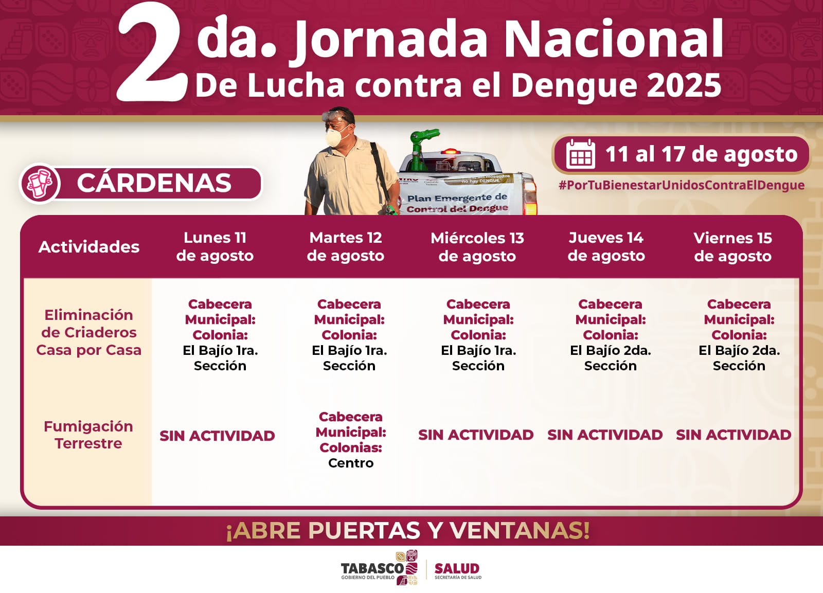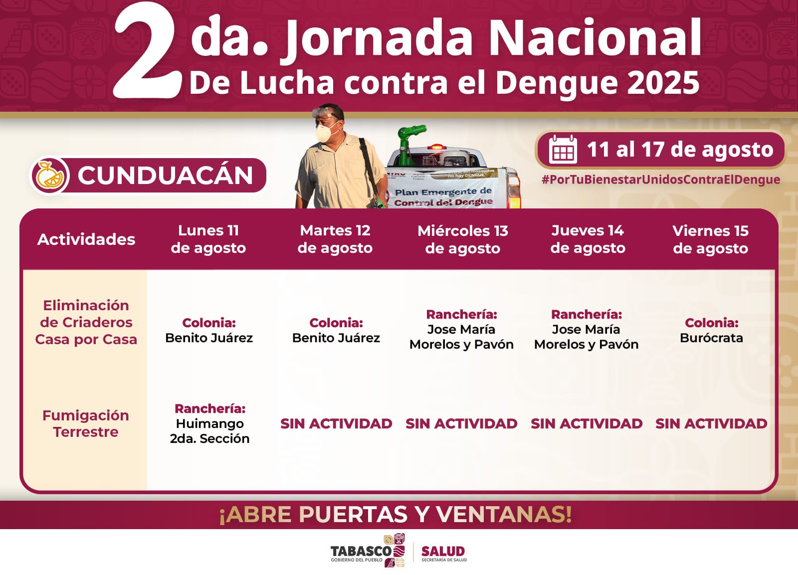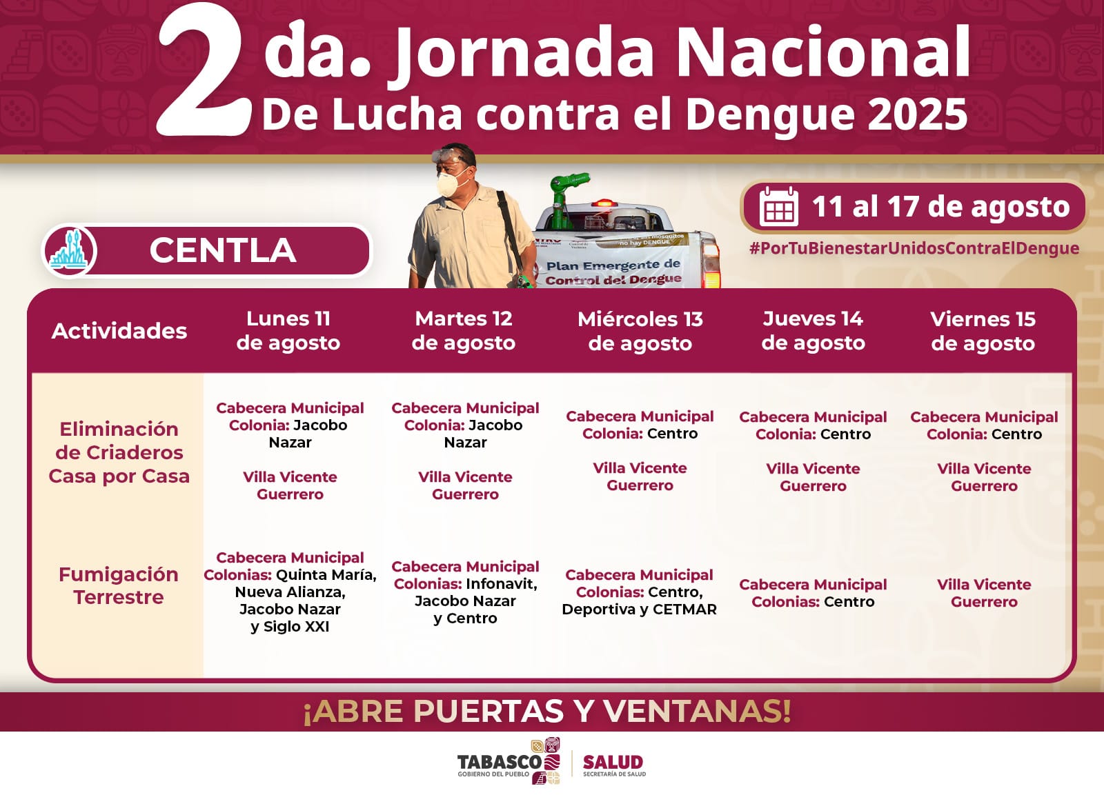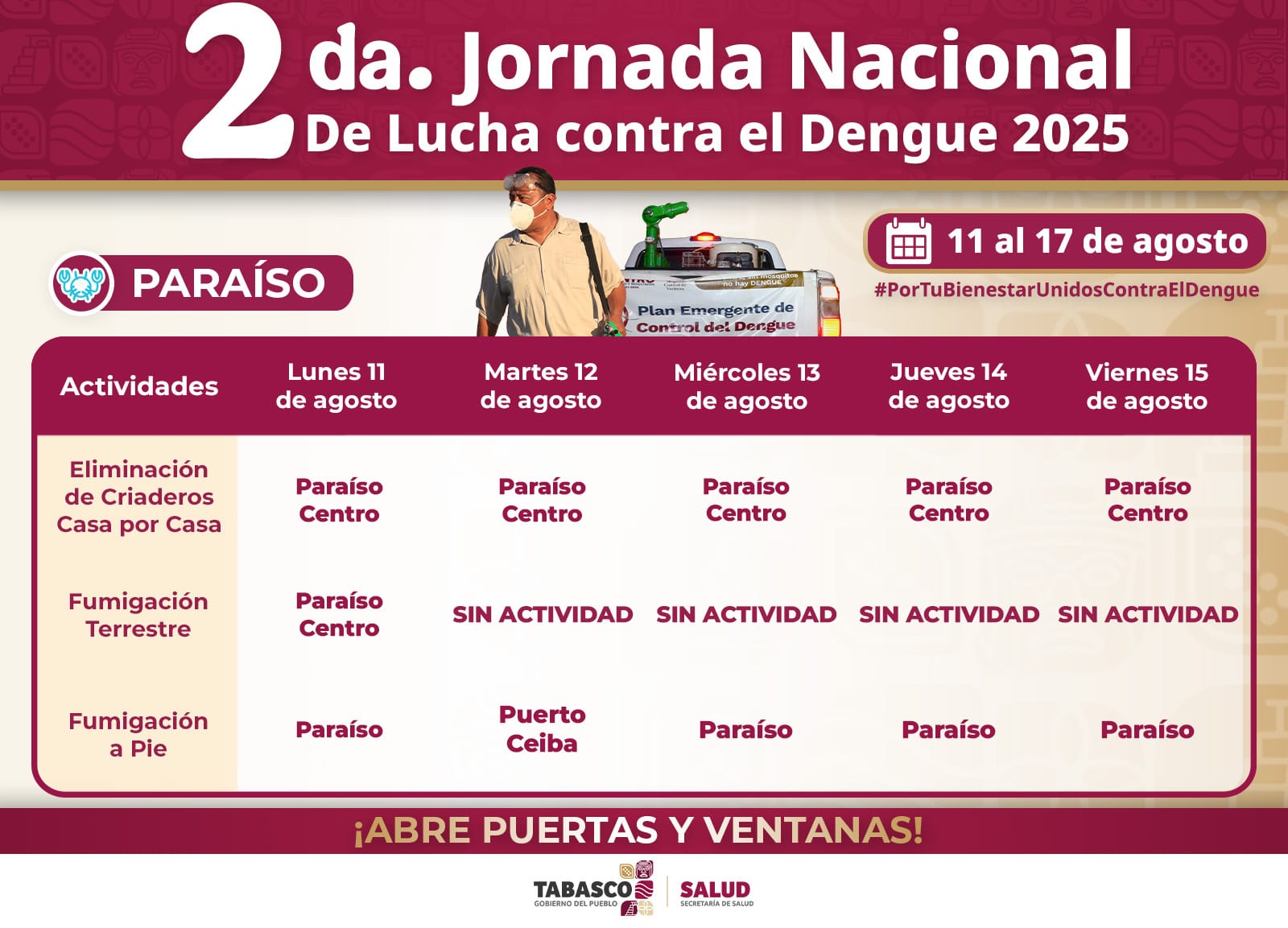 La Secretaría de Salud informa a la población tabasqueña que del 11 al 15 de Agosto, se continuarán los operativos de fumigación terrestre y eliminación de criaderos de mosquitos casa por casa en los 17 municipios del Estado.