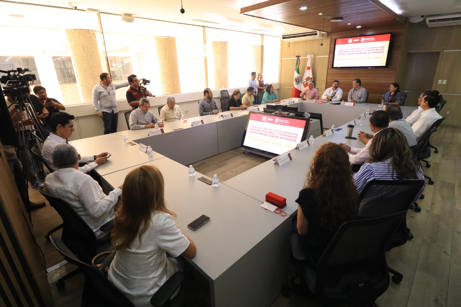 El secretario de Salud, Alejandro Calderón Alipi y el rector de la Universidad Juárez Autónoma de Tabasco (UJAT), Guillermo Narváez Osorio firmaron un convenio de colaboración para continuar fortaleciendo las campañas de donación de sangre altruista, entre la población estudiantil.