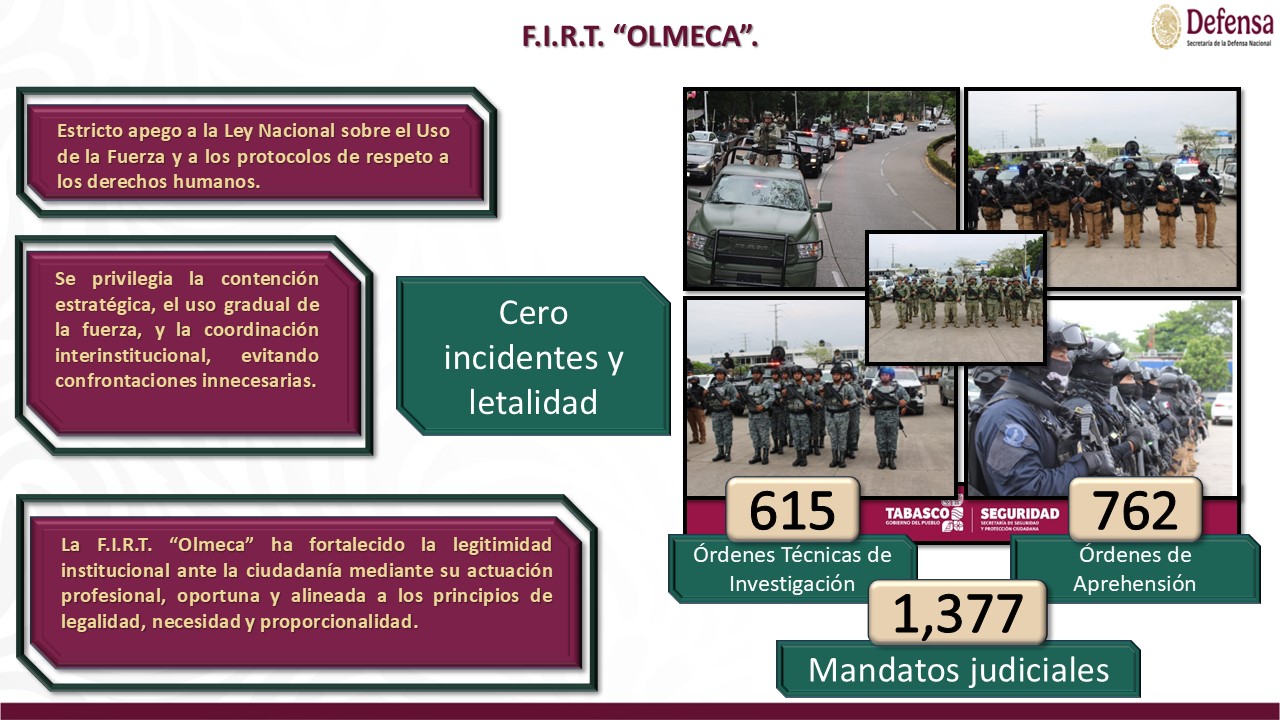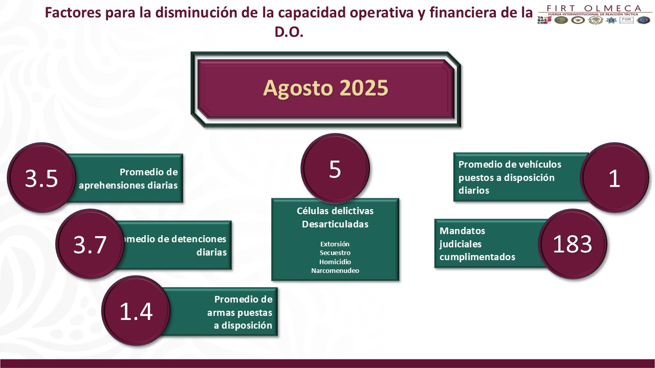 Este esfuerzo de la Fuerza Interinstitucional de Reacción Táctica (FIRT) Olmeca es equivalente al aseguramiento diario de 1.4 armas de fuego, 3.7 aprehensiones y 3.5 detenidos. “Y dosis de drogas también casi 830% más aseguradas. Hay más carpetas de investigación, porque hay más detenidos relacionados con este delito; sí, estamos trabajando como lo dijo el señor Gobernador, estamos trabajando y eso incrementa”, explicó.