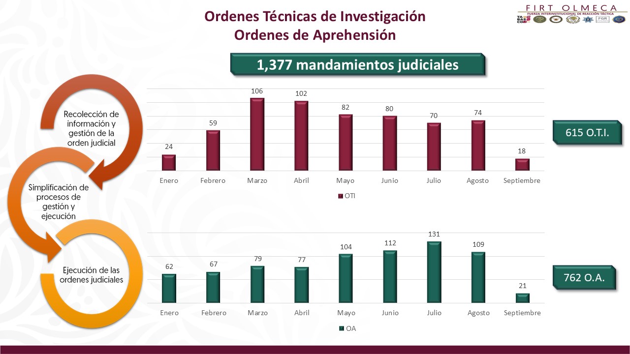 El número de detenciones significa un incremento de más del 339%, explicó en compañía de los integrantes de la Mesa de Paz y Seguridad. “Se dice fácil seis meses, pero ha sido un trabajo intenso de todos los integrantes, porque no es fácil el otorgamiento de una orden de aprehensión, mucho menos de una orden técnica de investigación, porque es un proceso de búsqueda de información, judicialización y justificación ante el juez. Y lo hemos hecho de manera muy satisfactoria y con buenos resultados”, mencionó.