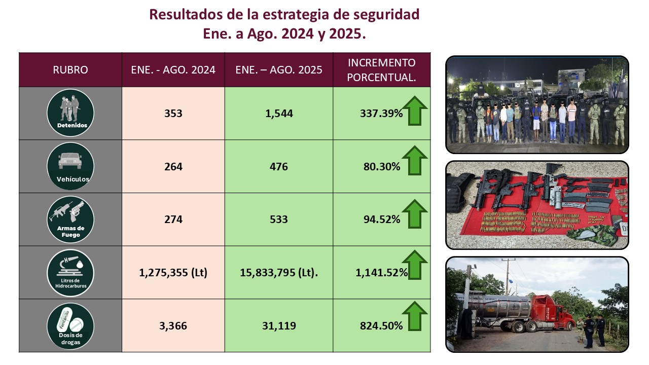 López Martínez informó que, en el comparativo con el periodo enero-agosto de 2024, en el año actual se incrementó en 1 mil 141.52% el aseguramiento de hidrocarburo de procedencia ilícita, con valor de casi 200 millones de pesos; 824.50% las dosis de drogas; 80.30% en el de vehículos asegurados, y de 94.52% en la cantidad de armas de fuego decomisadas.