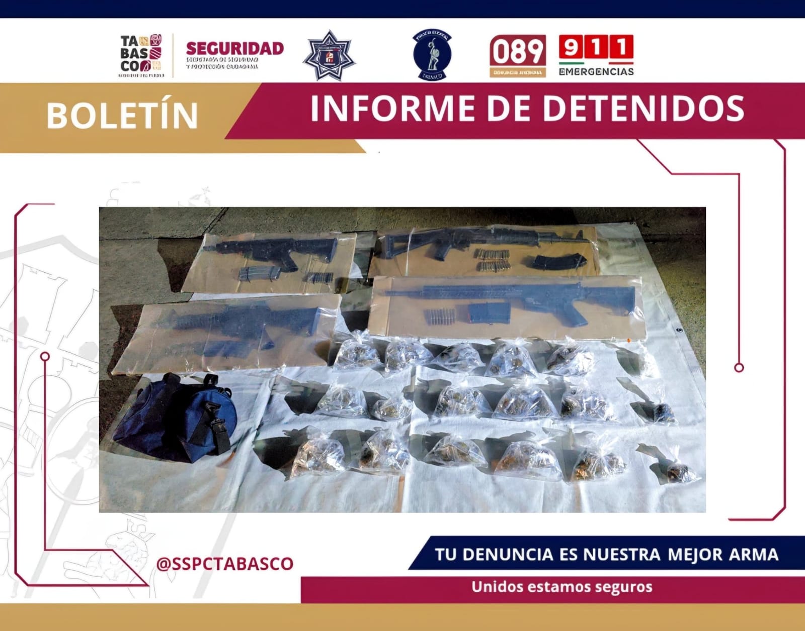 Como parte de la estrategia antiextorsión y derivado del recorrido como del Plan de Contención del Delito desplegado por la FIRT Olmeca, del cual forma parte la Secretaría de Seguridad y Protección Ciudadana de Tabasco, en las inmediaciones de la carretera Villahermosa – Cárdenas, en la ranchería Plátano y Cacao 2da. sección, del municipio de Centro, fueron detenidas seis personas por su probable participación en los delitos contra la Ley General de Salud, Contra la Ley Federal de Armas de Fuego y Explosivos y su probable partición en el cobro de piso, constitutivo del delito de extorsión.