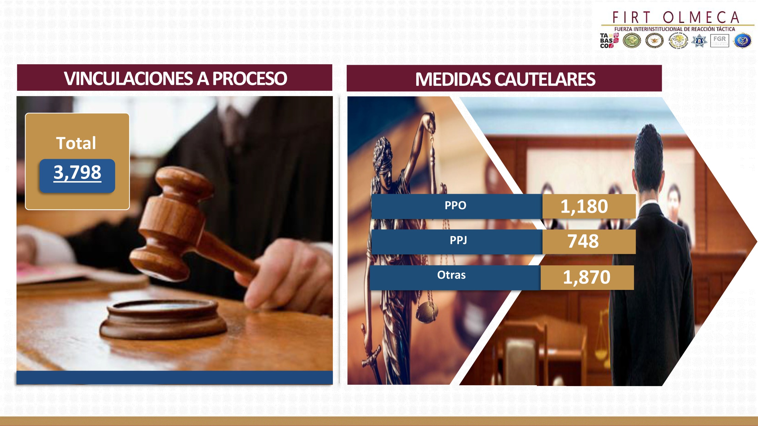 De manera coordinada y producto del trabajo de inteligencia, investigación y seguimiento jurídico, Tabasco avanza contundentemente en materia de procuración de justicia con 2 mil 621 detenidos y 3 mil 798 vinculaciones a proceso, por delitos de fuero común; en tanto que, en procesos federales, se contabilizan cifras sin precedentes, como el incremento en 391 por ciento en vinculaciones a proceso, del 275 en judicializaciones, 250 en cateos y 233 en la obtención de sentencias condenatorias en lo que va del año.