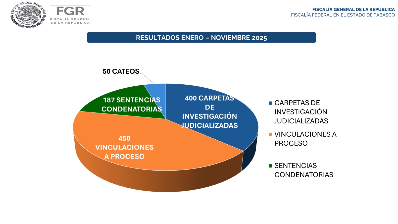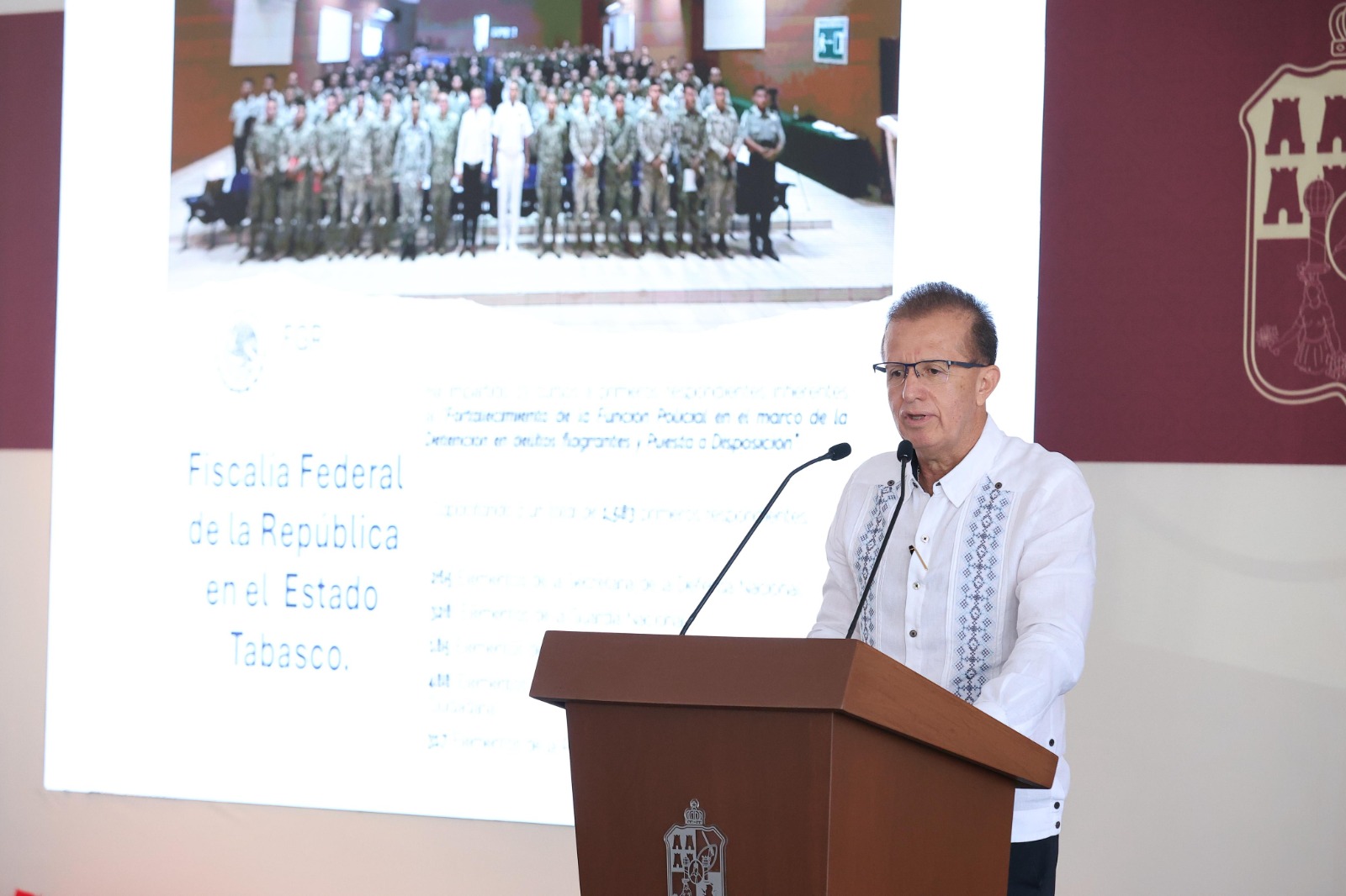 En su oportunidad, el delegado de la FGR en Tabasco, Martín Rivera Cisneros, apuntó que, en un hecho sin precedentes, en el ámbito de la justicia federal se han obtenido 187 sentencias condenatorias y se han judicializado 400 carpetas de investigación; además, se lograron 450 vinculaciones a proceso, como parte de las acciones orientadas a lograr la paz y seguridad en la entidad.