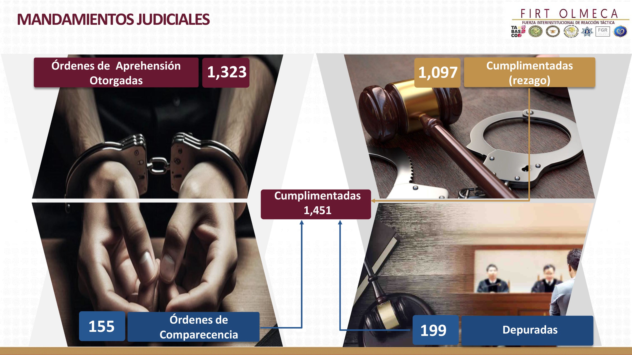 Además, añadió, se han ejecutado 751 cateos y, a la fecha se cuenta con mil 451 mandamientos judiciales cumplimentados y mil 323 órdenes de aprehensión otorgadas, de las cuales se han cumplimentado mil 97, logrando un avance sustancial en el rezago que se tenía en esta materia.