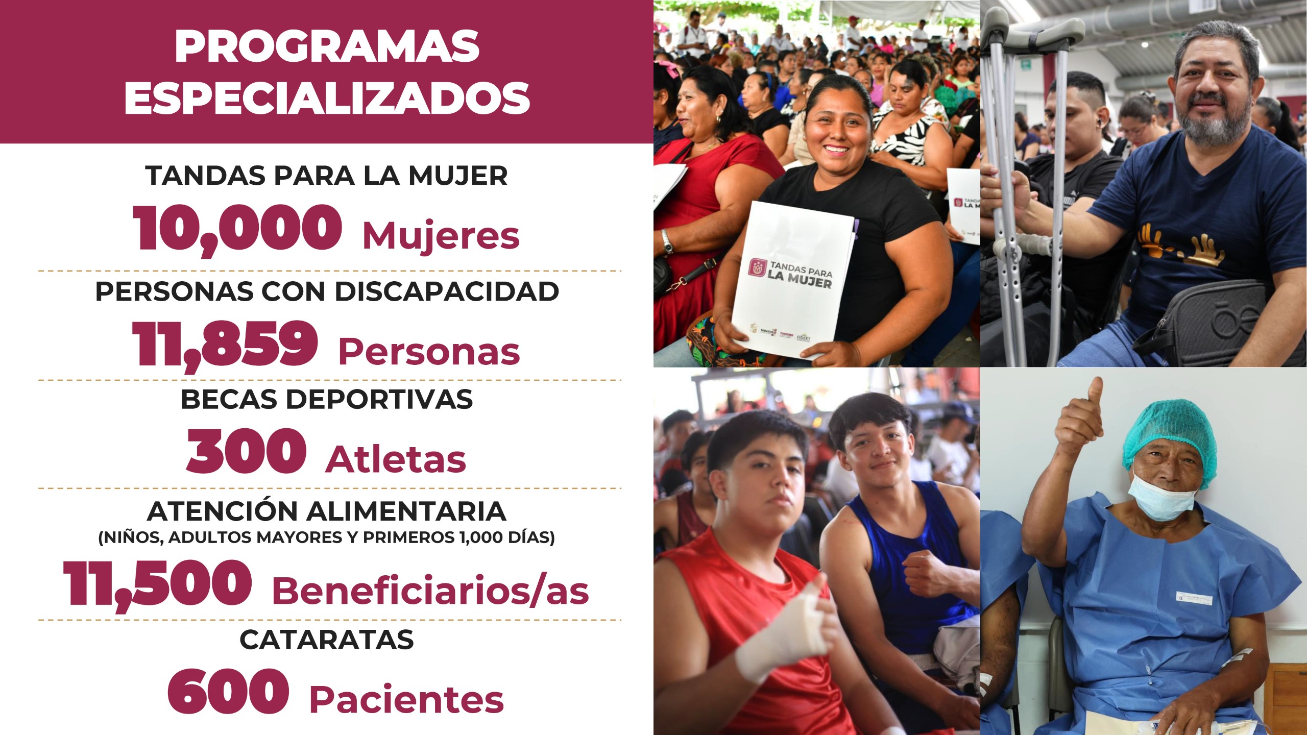 A través de los programas especializados, señaló que se atendieron a 10 mil jefas de familia con Tandas para la Mujer; 11 mil 859 personas con discapacidad; 300 atletas de alto rendimiento con becas deportivas; 11 mil 500 niños y adultos mayores con Atención Alimentaria y 600 pacientes para tratamiento de cataratas.