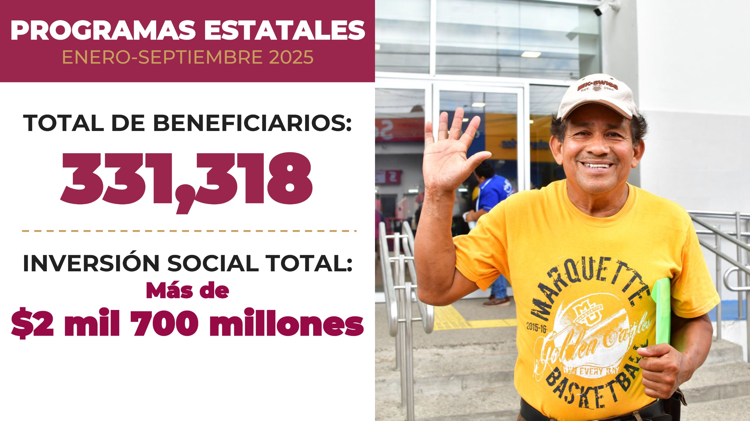 Subrayó que, de enero a septiembre, a través de los programas sociales estatales, se han beneficiado a 331 mil 338 personas, con una inversión de más de dos mil 700 millones de pesos, distribuidos en mil 104 millones en Viviendas para el Bienestar; más de 451 millones de pesos en Pescando Vida; 245 millones en Sembrando Vida Tabasco; más de 211 millones en Crédito Ganadero a la Palabra; y 194 millones de pesos en Bienestar y Plenitud.
