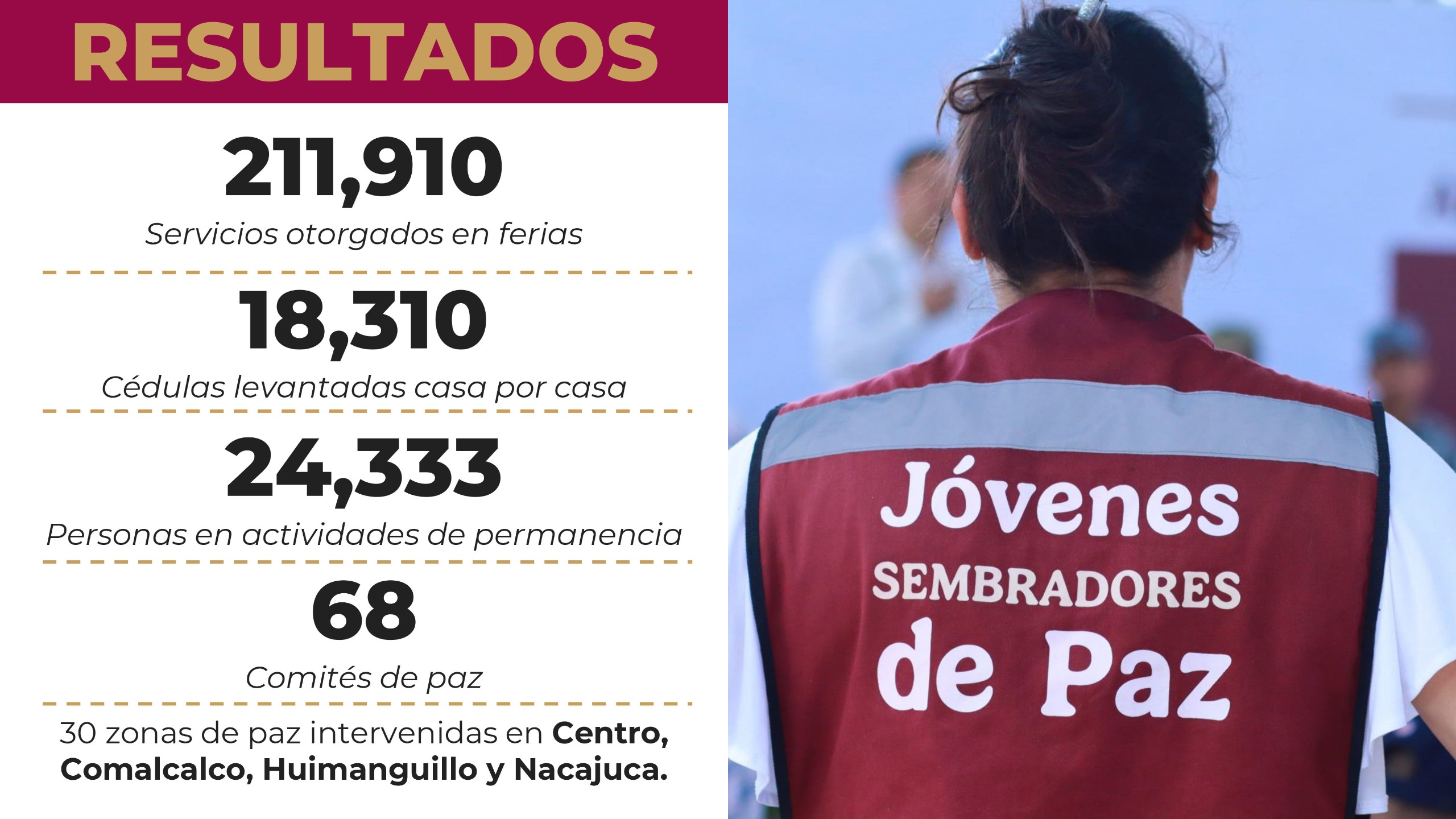 Puntualizó que se han brindado 211 mil 910 servicios en ferias y se han levantado 18 mil 310 cédulas casa por casa; en actividades de permanencia se ha alcanzado a 24 mil 333 personas e instalado 68 comités de paz, en 30 zonas de los municipios de Centro, Comalcalco, Huimanguillo y Nacajuca.