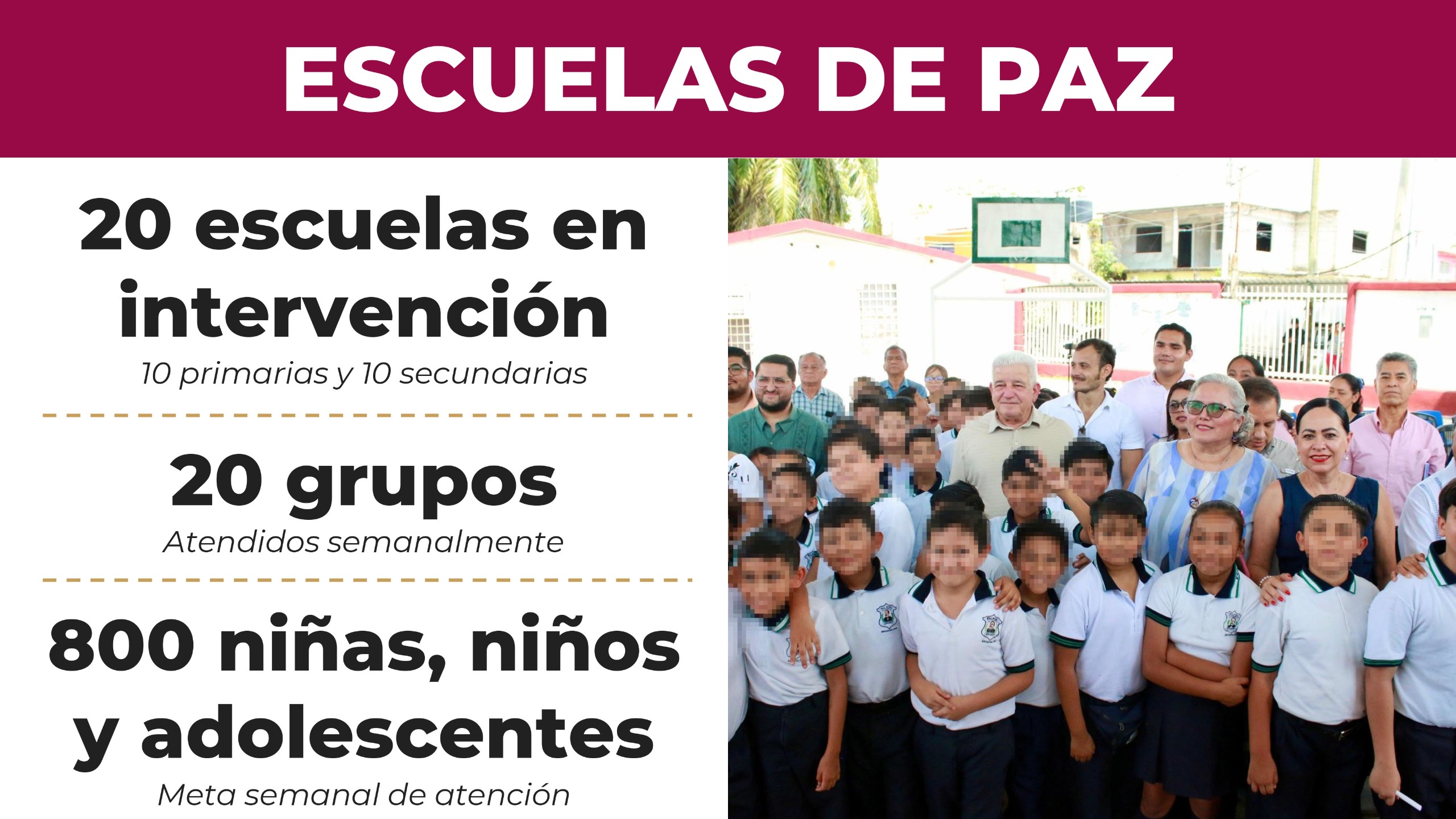 De igual manera mediante el programa Escuelas de Paz, se han intervinieron 20 centros educativos: 10 en primaria y 10 en secundaria, con una meta de más de 800 niñas, niños y adolescentes atendidos semanalmente.