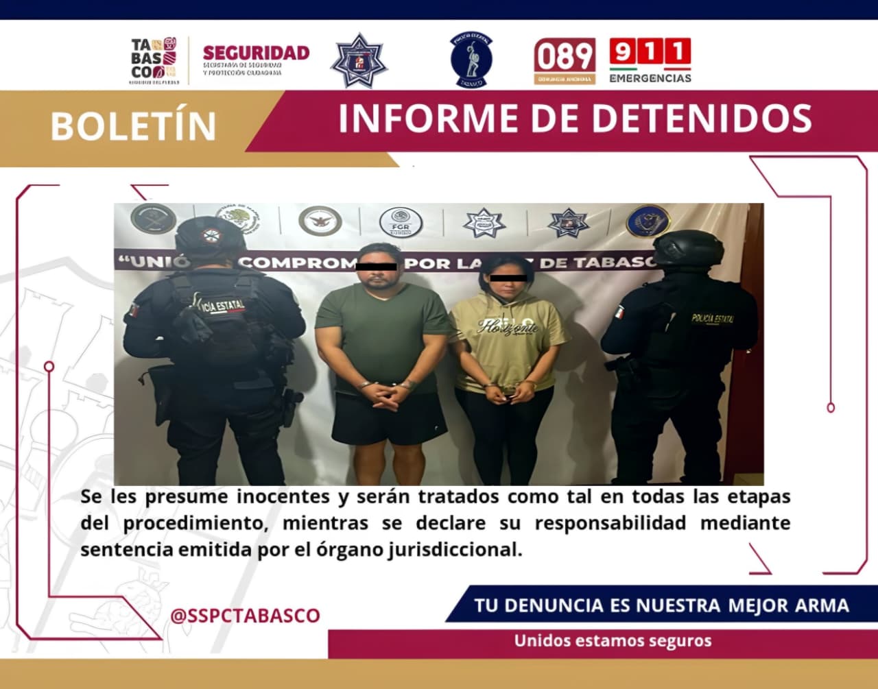 En recorridos de seguridad, vigilancia y prevención del delito, sobre la carretera federal Villahermosa-Ciudad del Carmen, a la altura de la Barra de San Pedro, del municipio de Centla, se logró la detención de Humberto «N» de 46 años, alias «Beto Coca» y Luisa Irasema “N” alias “La Señora”, de 44 años.