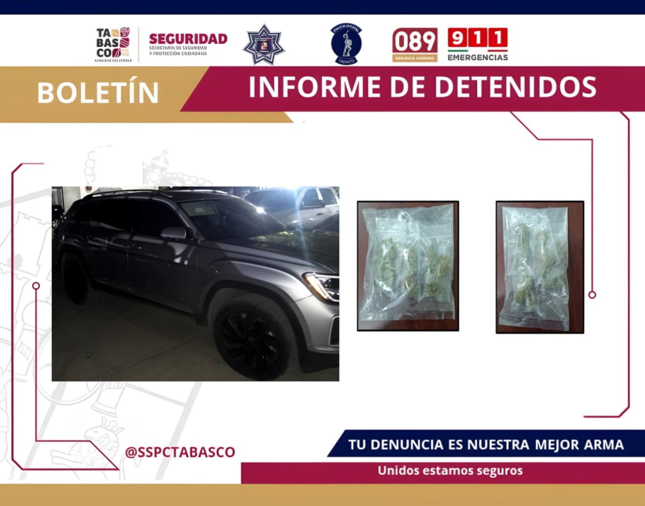 A los detenidos se les aseguró bolsitas transparentes que en su interior contenían hierba seca color verde con características similares a la marihuana y un vehículo Volkswagen Teramont de color gris.