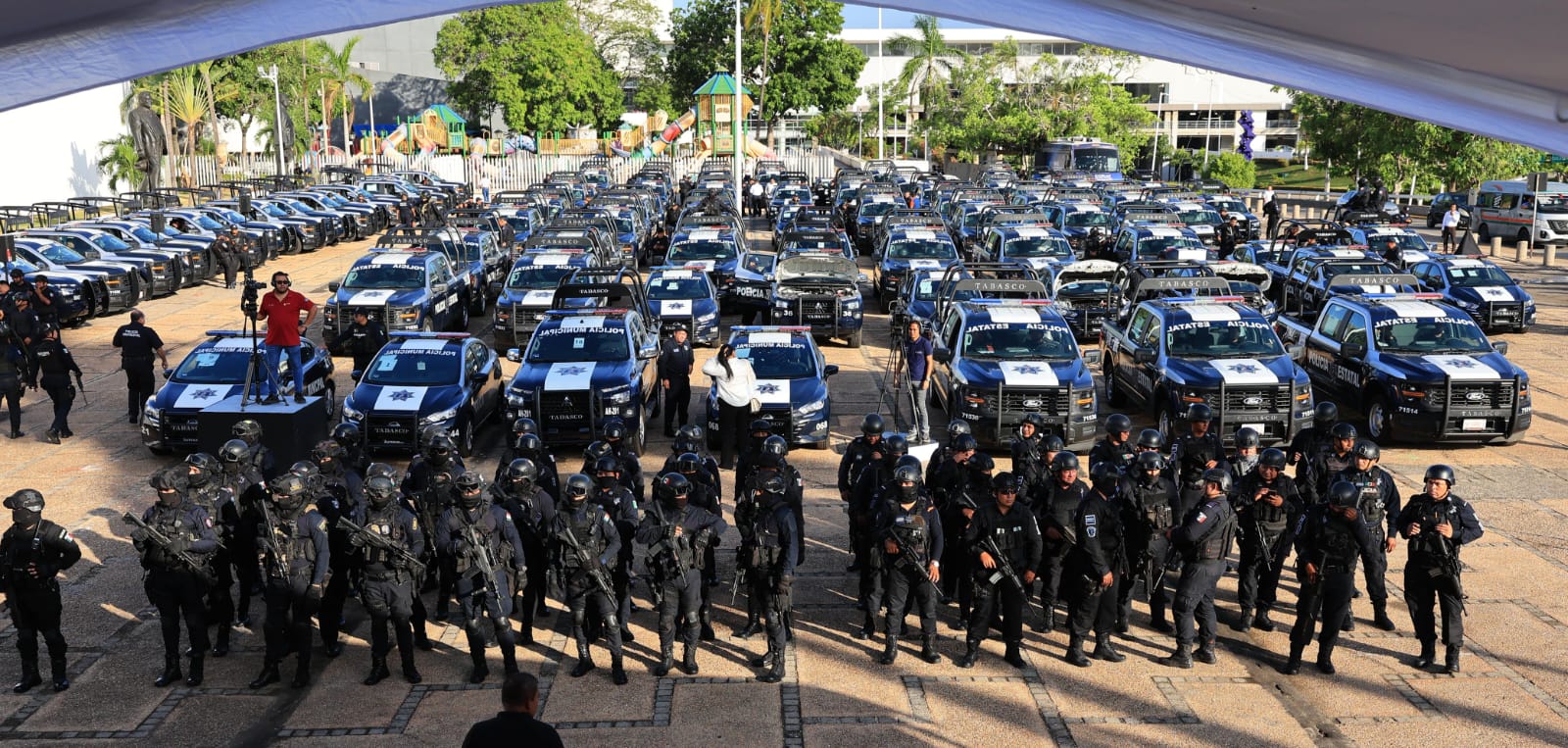 Ante las y los 17 presidentes municipales, líderes del sector empresarial e integrantes de la Mesa para la Construcción de Paz y Seguridad que agrupa a autoridades estatales y federales, el mandatario puso al servicio de las y los tabasqueños 100 nuevas patrullas, desde autos compactos y camionetas, hasta unidades tácticas de reacción blindadas, y de alto poder denominadas Rhino, con capacidad de intervención en situaciones de alto riesgo.