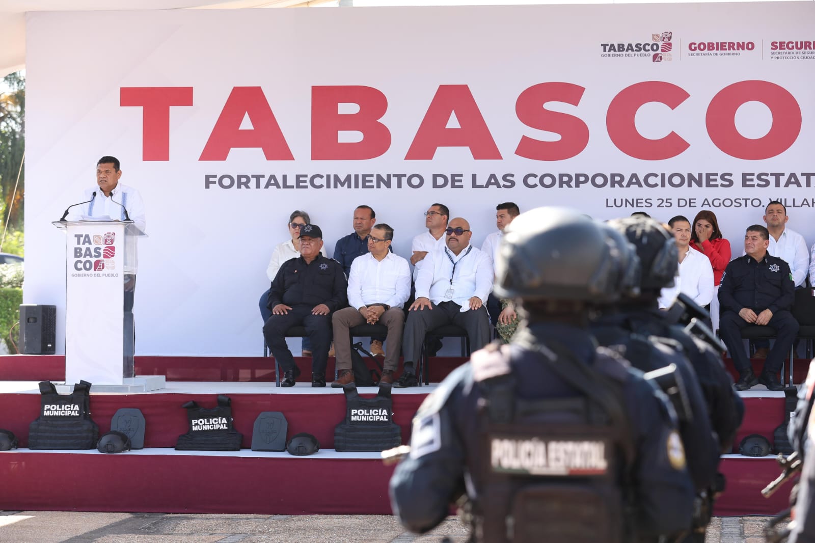 “Nosotros no pactamos con la delincuencia y no protegemos a nadie; nosotros queremos el bien del pueblo. Por eso todos los recursos, todas las instituciones, todos los esfuerzos, están dirigidos a la paz, a que la gente sea feliz”, aseveró en el evento denominado Tabasco Seguro, Fortalecimiento de las corporaciones estatales y municipales de seguridad pública, donde también entregó piezas de protección para los policías y equipamiento de diverso tipo para mejorar la operatividad, que en conjunto representan una inversión de casi cien millones de pesos.