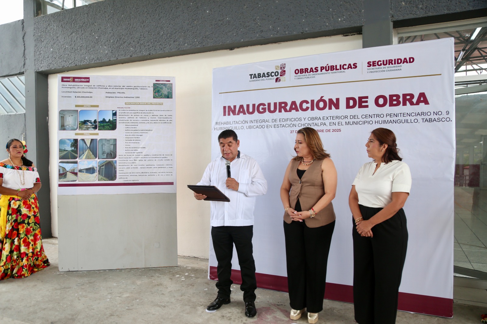 El Gobierno del Estado de Tabasco entregó este día la obra de rehabilitación integral del Centro Penitenciario No. 9, ubicado en Estación Chontalpa, Huimanguillo, para el cual se destinó una inversión de 250 millones de pesos, reafirmando el compromiso de mejorar la infraestructura de seguridad y garantizar condiciones dignas para las personas privadas de la libertad.