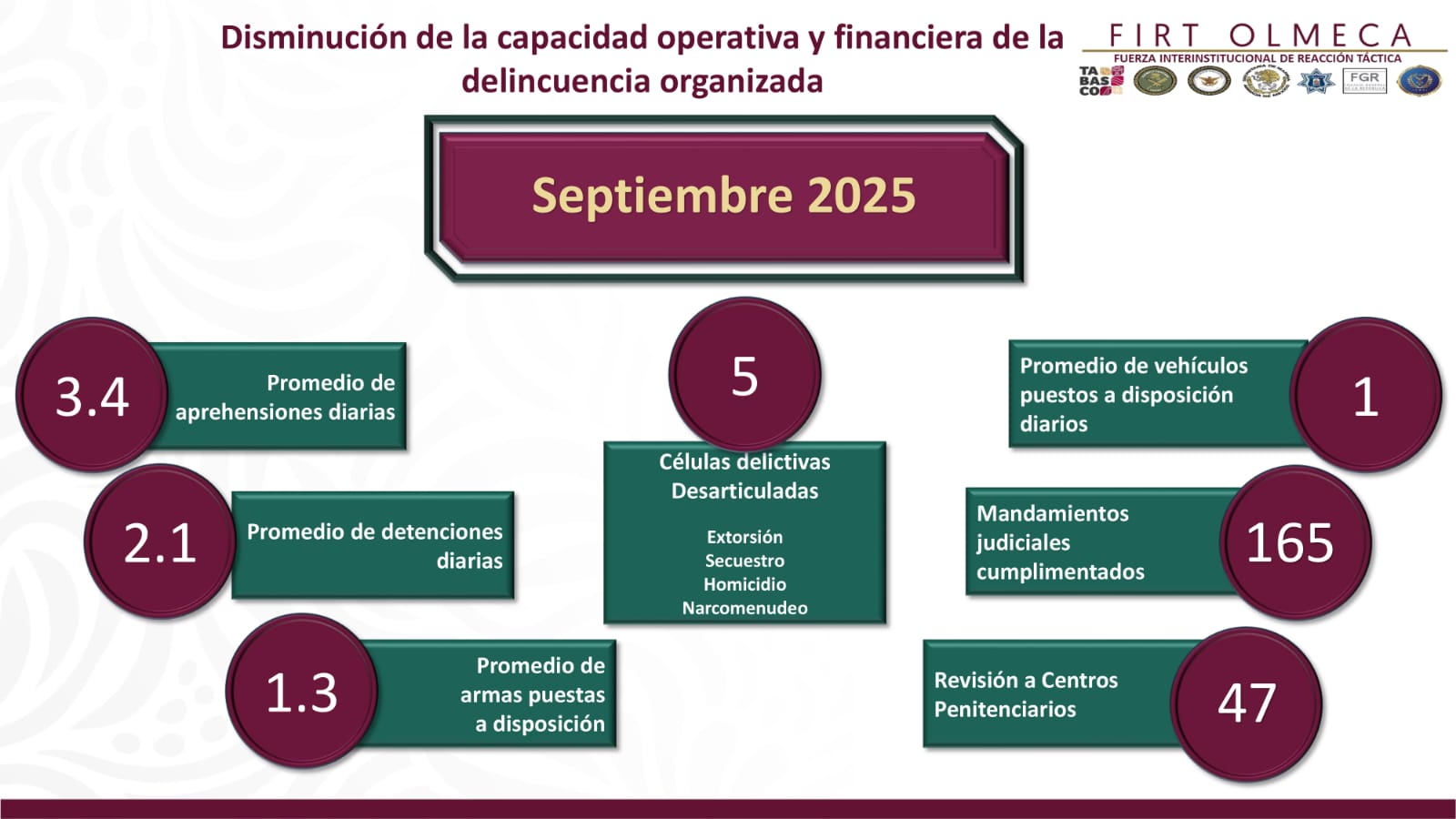 Amaya Guerrero resaltó que la estrategia de seguridad implementada ha sido factor en la disminución de la capacidad operativa y financiera de la delincuencia organizada. Tan solo en septiembre, se llevó a cabo la revisión a 47 centros penitenciarios, se desarticularon cinco células delictivas dedicadas a la extorsión, secuestro, homicidio y narcomenudeo, un promedio de 3.4 aprehensiones diarias y el cumplimiento de 165 mandamientos judiciales.