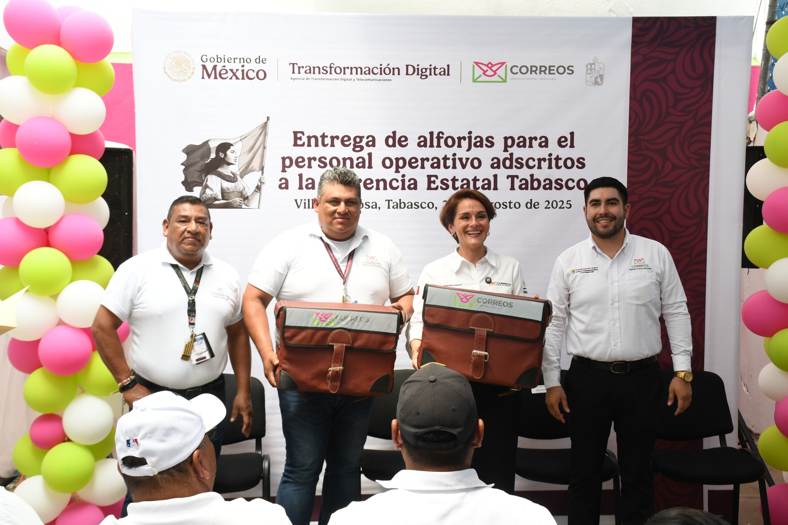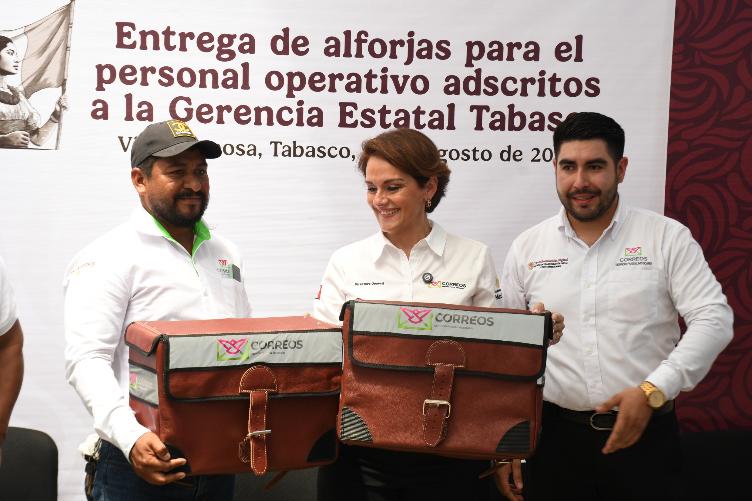 Como parte de las actividades realizadas en su tercera visita a Tabasco, la directora general de Sepomex llevó a cabo la entrega de alforjas a 16 carteras y carteros que laboran en la administración postal estatal, como parte de la estrategia para mejorar las condiciones laborales de las y los trabajadores postales.
