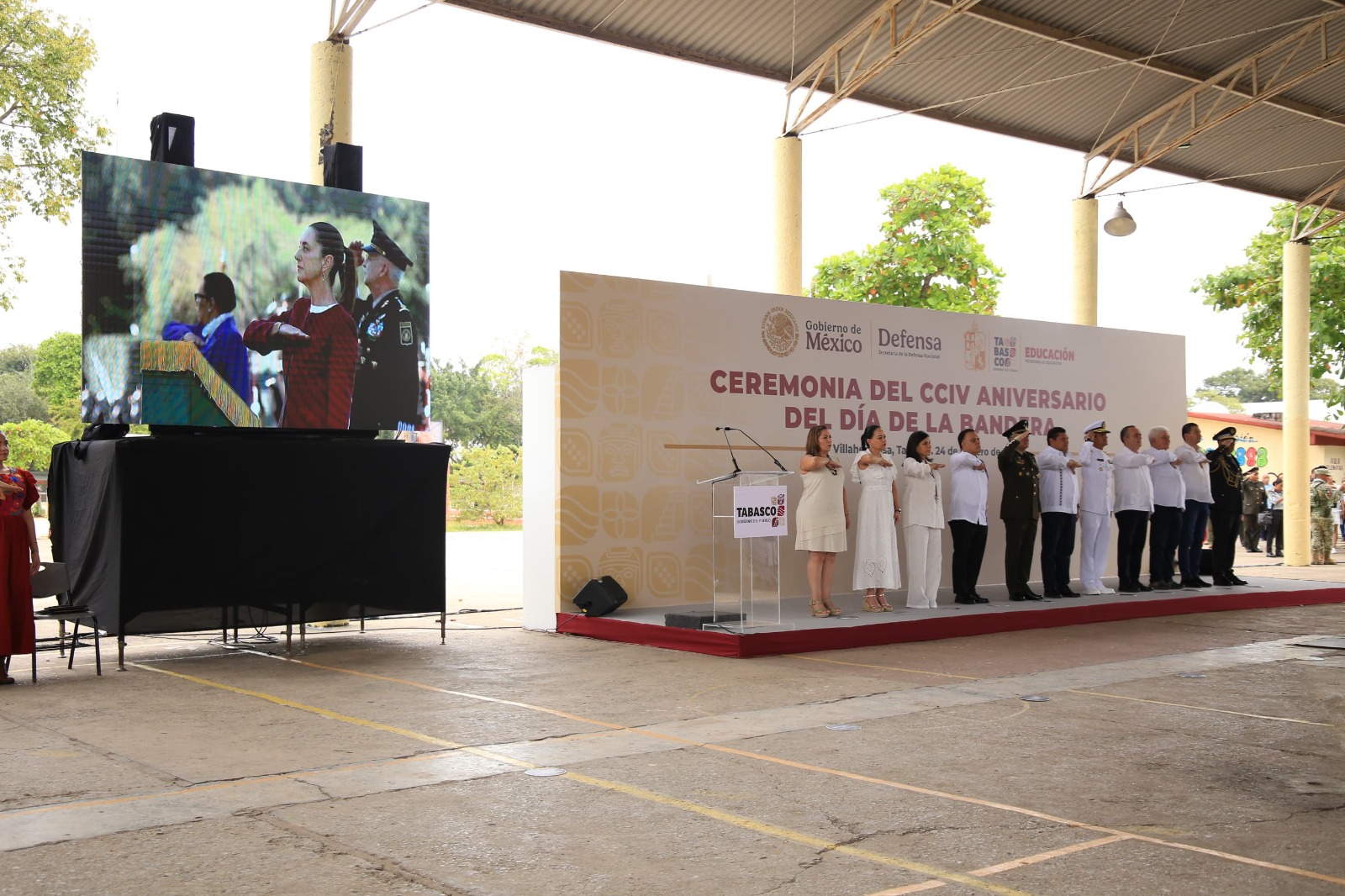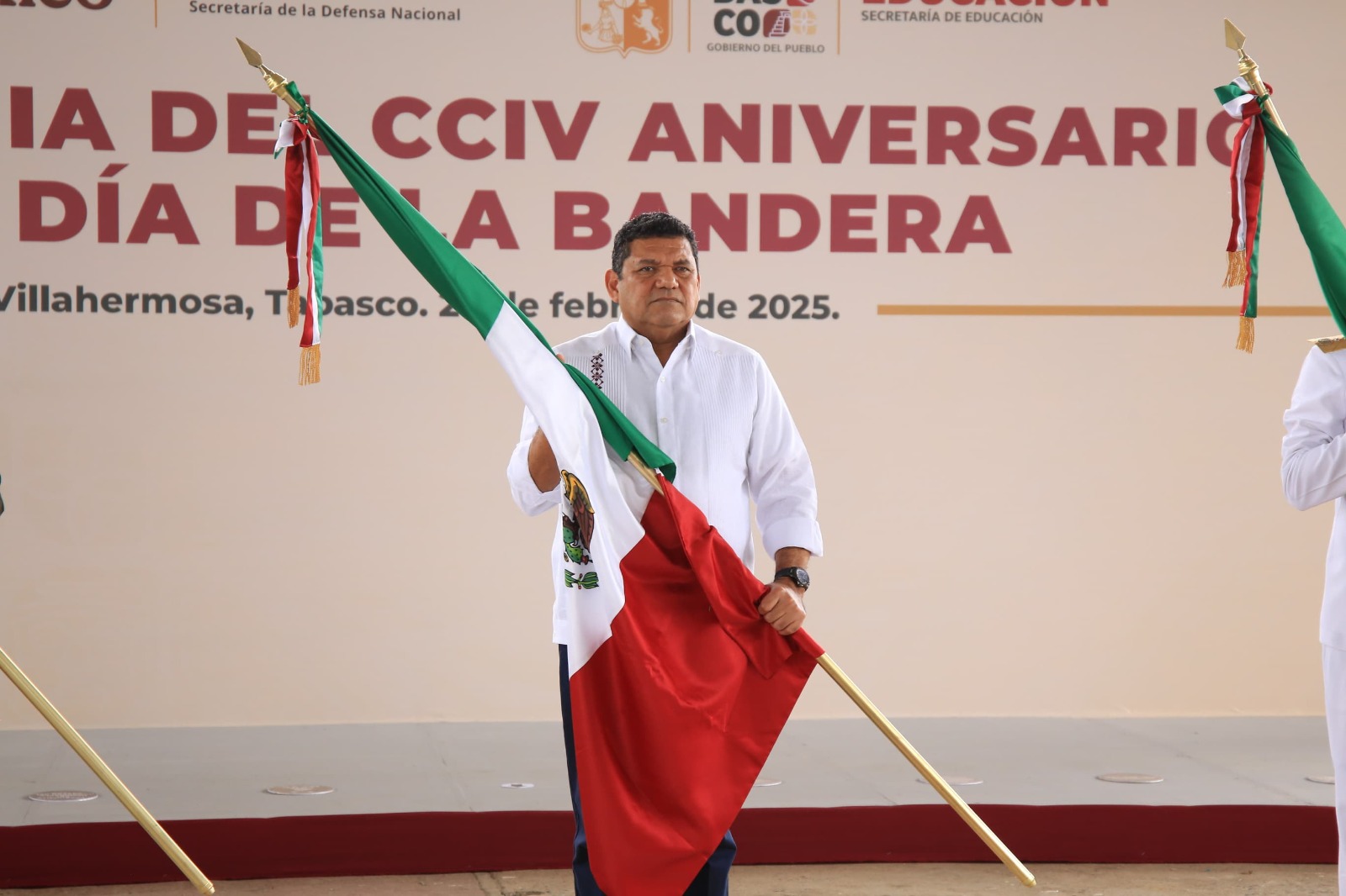 El Gobernador Javier May Rodríguez presidió el acto cívico conmemorativo del CCIV Aniversario del Día de la Bandera, en cuyo marco y enlazado vía remota con la ceremonia encabezada por la Presidenta de México, Claudia Sheinbaum Pardo, tomó protesta y abanderó a 25 escuelas de educación básica de Tabasco.