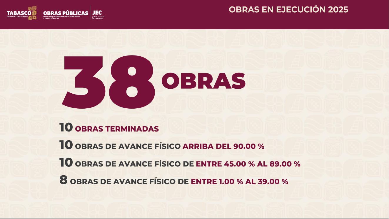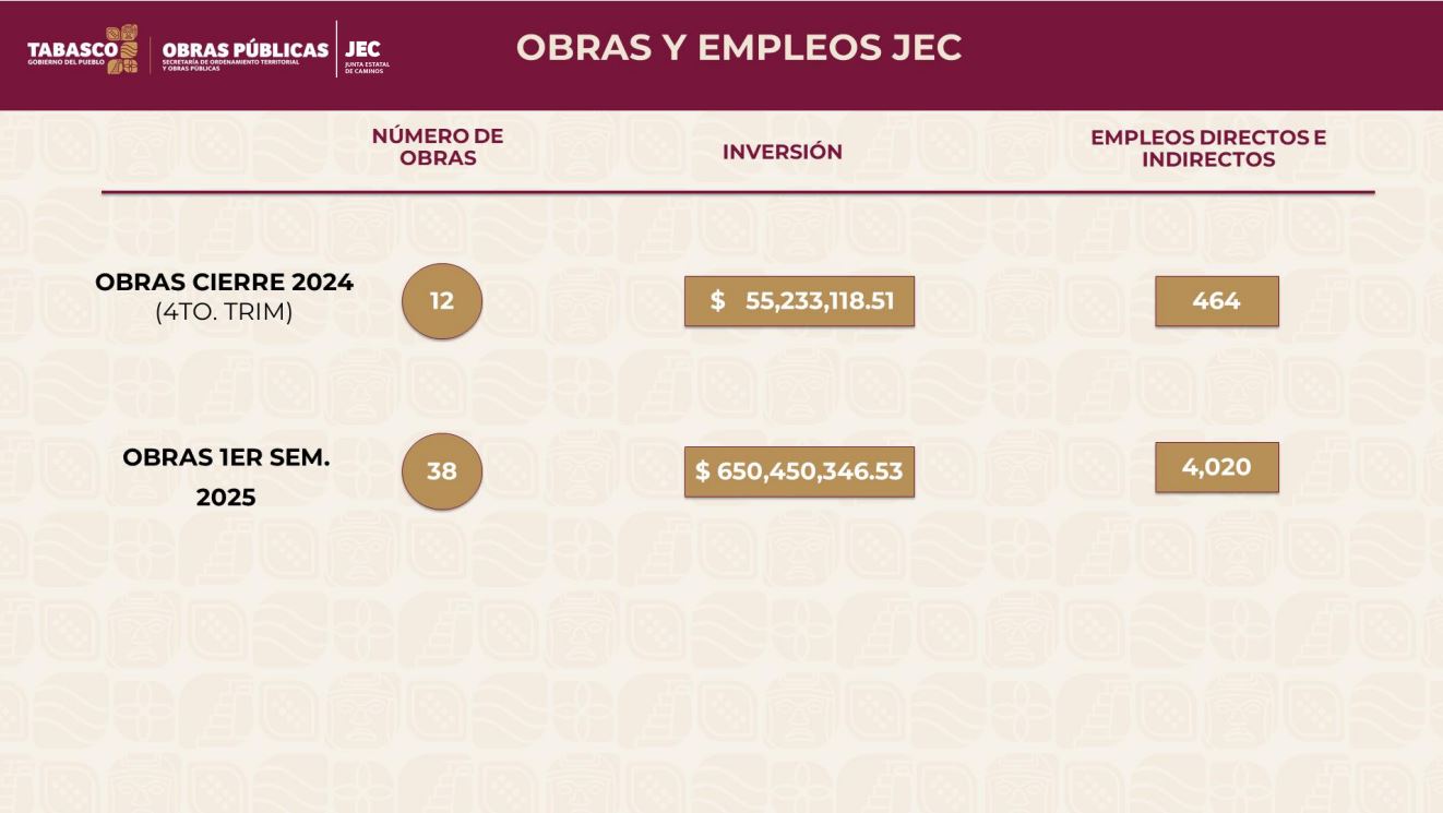 Al cierre del primer semestre del 2025, la Junta Estatal de Caminos (JEC) ha iniciado 38 obras en diferentes puntos del territorio tabasqueño, que redundarán en el mejoramiento de las vías de comunicación del orden estatal, y en las cuales el Gobierno del Pueblo ha destinado una inversión de 650 millones 450 mil 346 pesos, generado además 4 mil 20 empleos, informó su titular, Mario González Noverola.