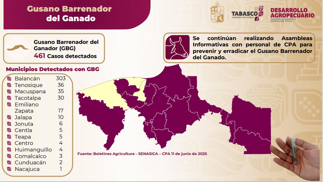 Joaquín Alejandro informó que se continúan haciendo reuniones informativas con productores de Balancán, Tenosique, Centla, Macuspana, Teapa y Emiliano Zapata. “En estas reuniones les mencionamos lo importante que es dar seguimiento a las heridas y, también se les dice que, si reportan un caso de gusano barrenador, su ganado no se cuarentena, no se sacrifica, ni se decomisa. Todo lo contrario, se les brinda apoyo”, acentuó.