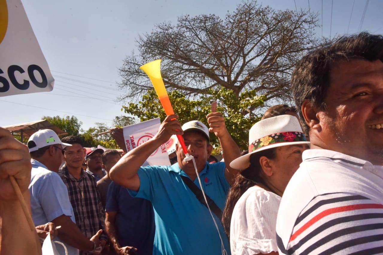 Exactamente, cuando arribaron al evento los titulares del Ejecutivo federal y estatal, a las 18:07, entre los gritos de «Presidenta presidenta” y «Viva May», el tronar de las matracas y silbatos, se oyó el cornetín de don Martín Rivera Ramos, vecino del poblado C-9, de Cárdenas.