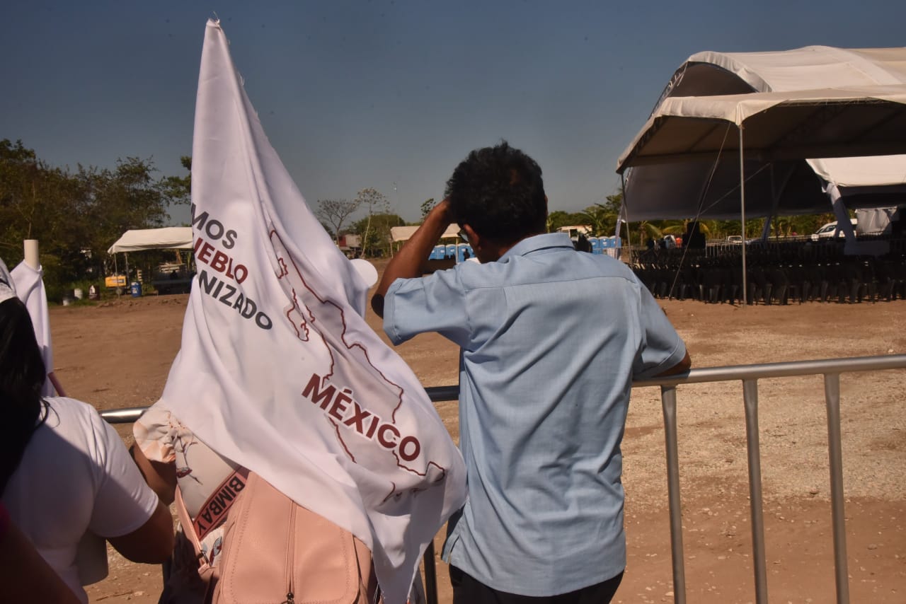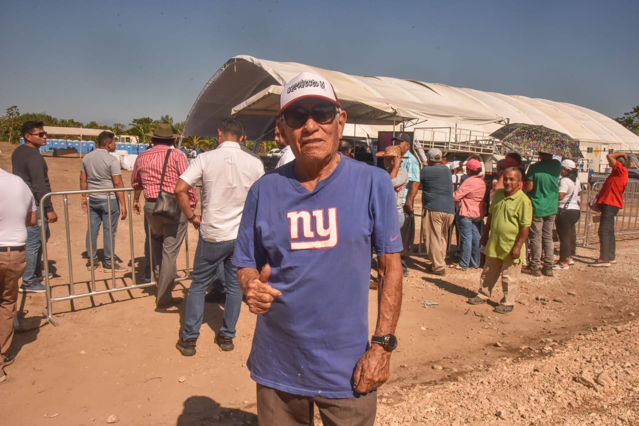 Del centro de la cabecera municipal, don Mario Casado llegó temprano al lugar porque quería alcanzar asiento y saludar a la Presidenta de México. Conoce las colonias aledañas: la Frutales, la Walter Herrera y la Valle Verde, pero su incógnita es saber cómo se llamará la nueva colonia de casas del Bienestar.