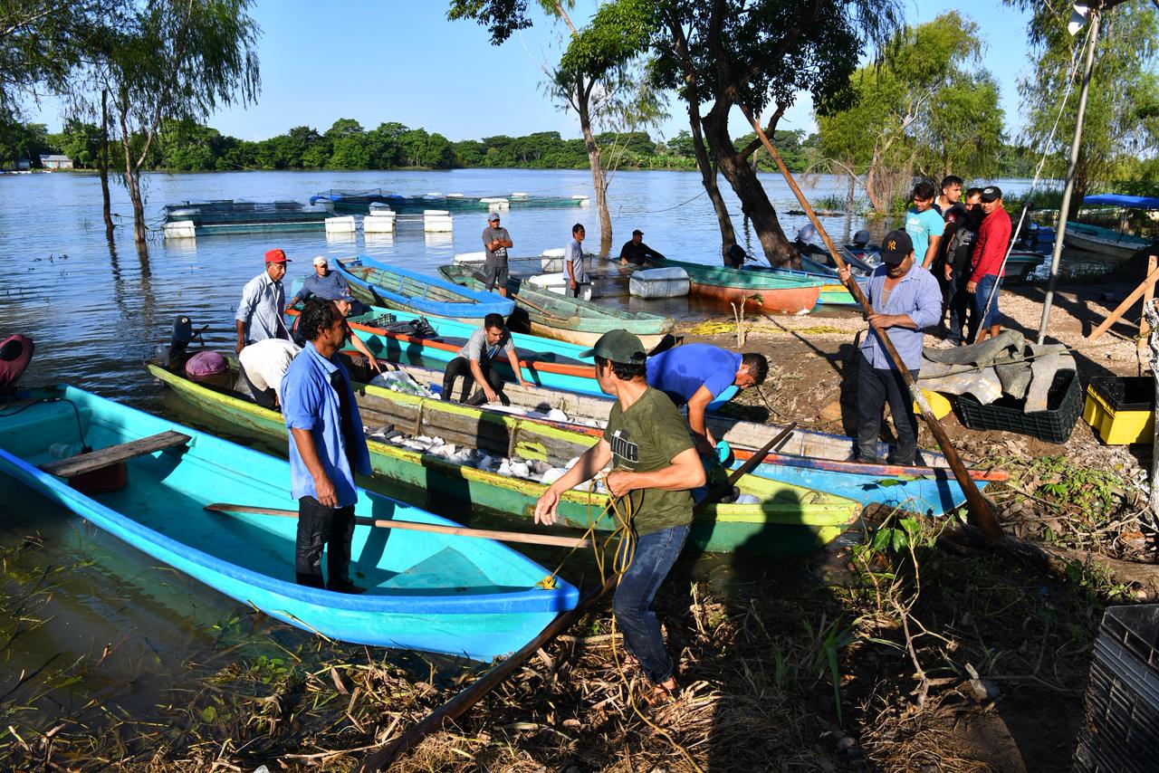 Ayudando a colocar las tilapias en las taras, el técnico Pedro Luis Cruz de la Cruz, a cargo de 100 pescadoras y pescadores de los poblados Trinidad, Zapotal, Corcovado y Rivera Baja, reconoció que “la gente está muy contenta, a pesar de que tuvimos muchos problemas con la temperatura del agua, durante abril y mayo, por la temporada de seca. Pero, a pesar de esto, tenemos un buen resultado: Mínimo han tenido 250 peces en cada jaula”.