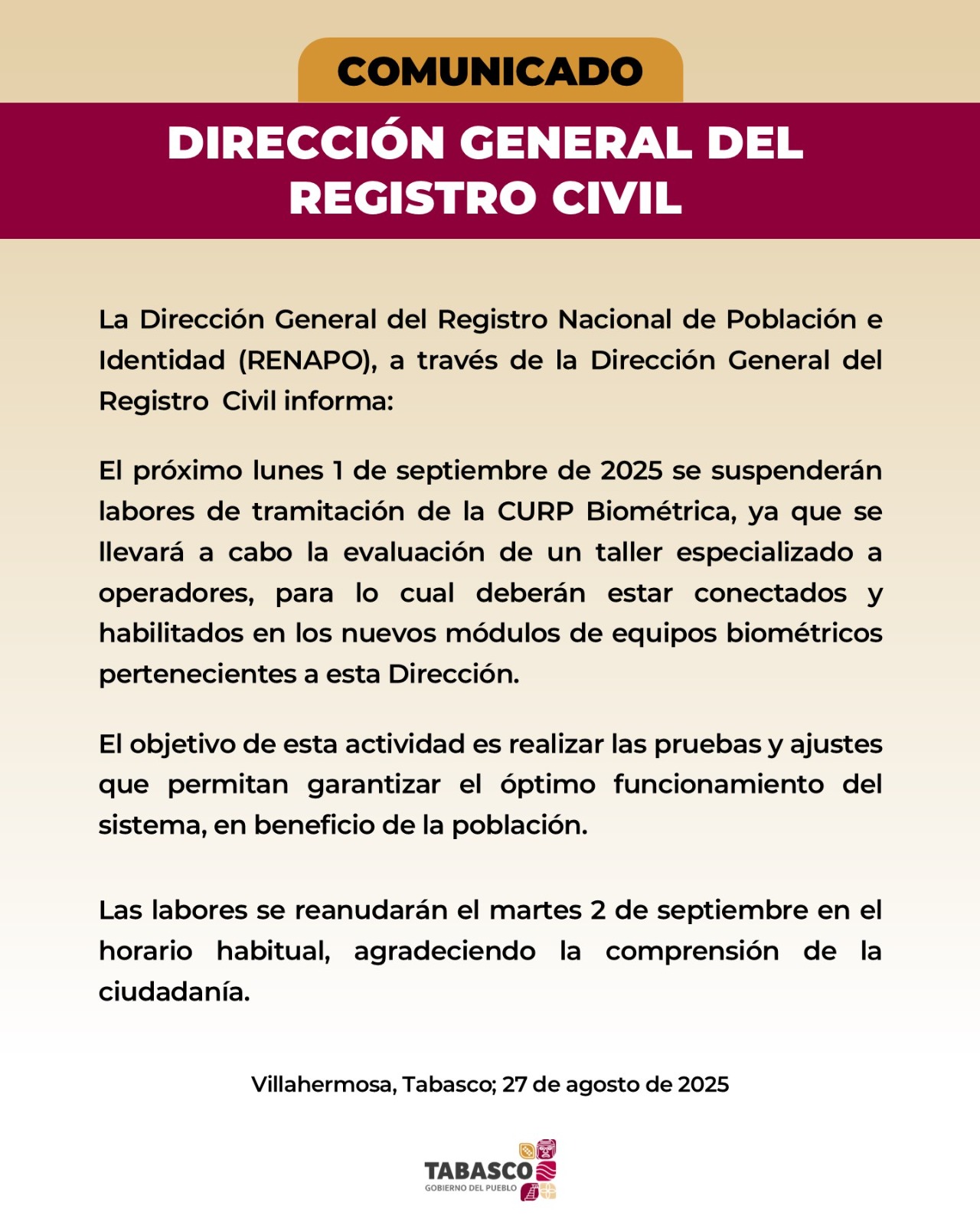 El próximo lunes 1 de septiembre de 2025 se suspenderán labores de tramitación de la CURP Biométrica, ya que se llevará a cabo la evaluación de un taller especializado a operadores, para lo cual deberán estar conectados y habilitados en los nuevos módulos de equipos biométricos pertenecientes a dicha Dirección.