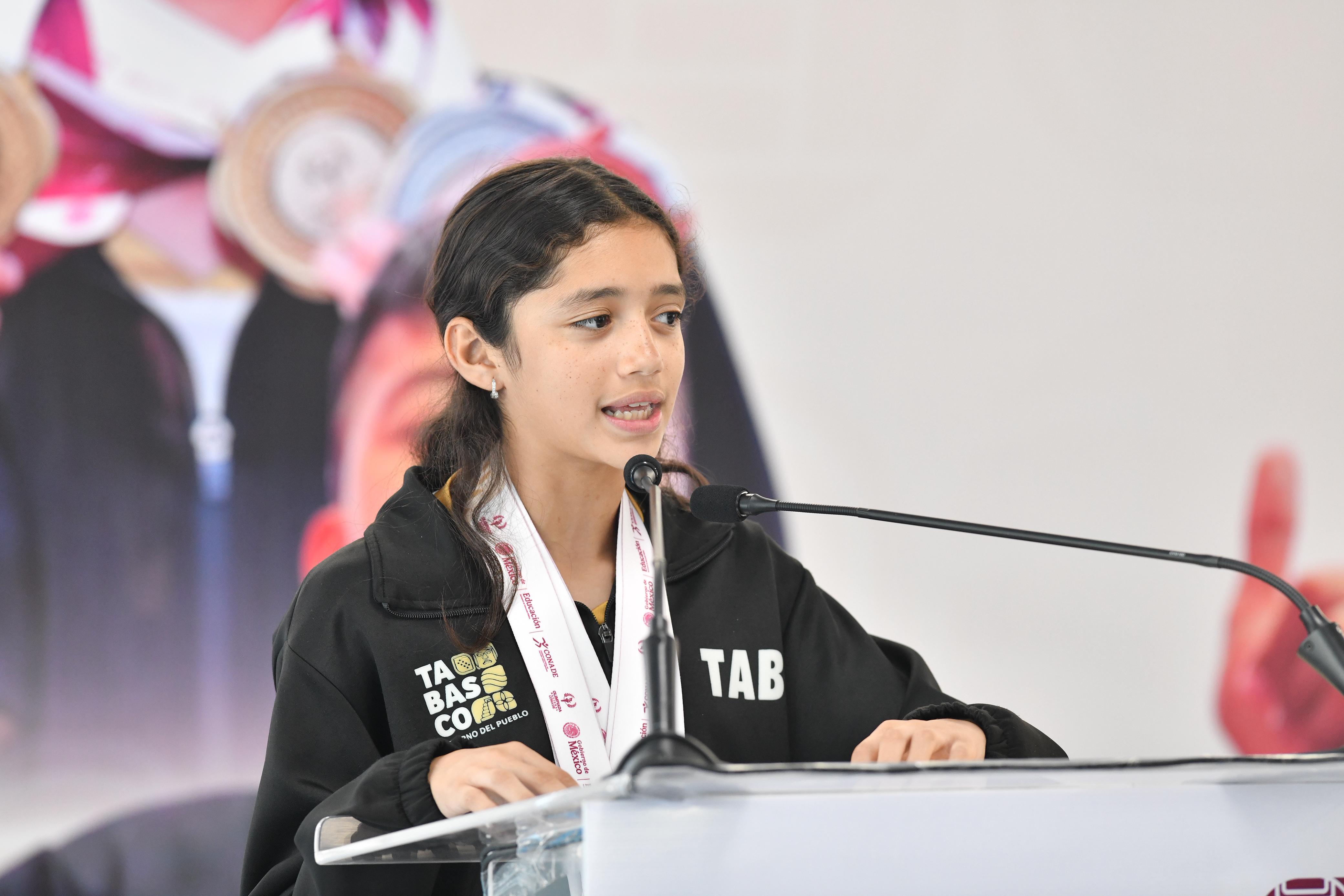 En representación de los atletas tabasqueños, Elisa Ramírez del Puerto, quien ganó cuatro medallas de oro, una de plata y una de bronce en la disciplina de patines sobre ruedas, agradeció al Gobernador Javier May por depositar su confianza en cada uno de ellos.