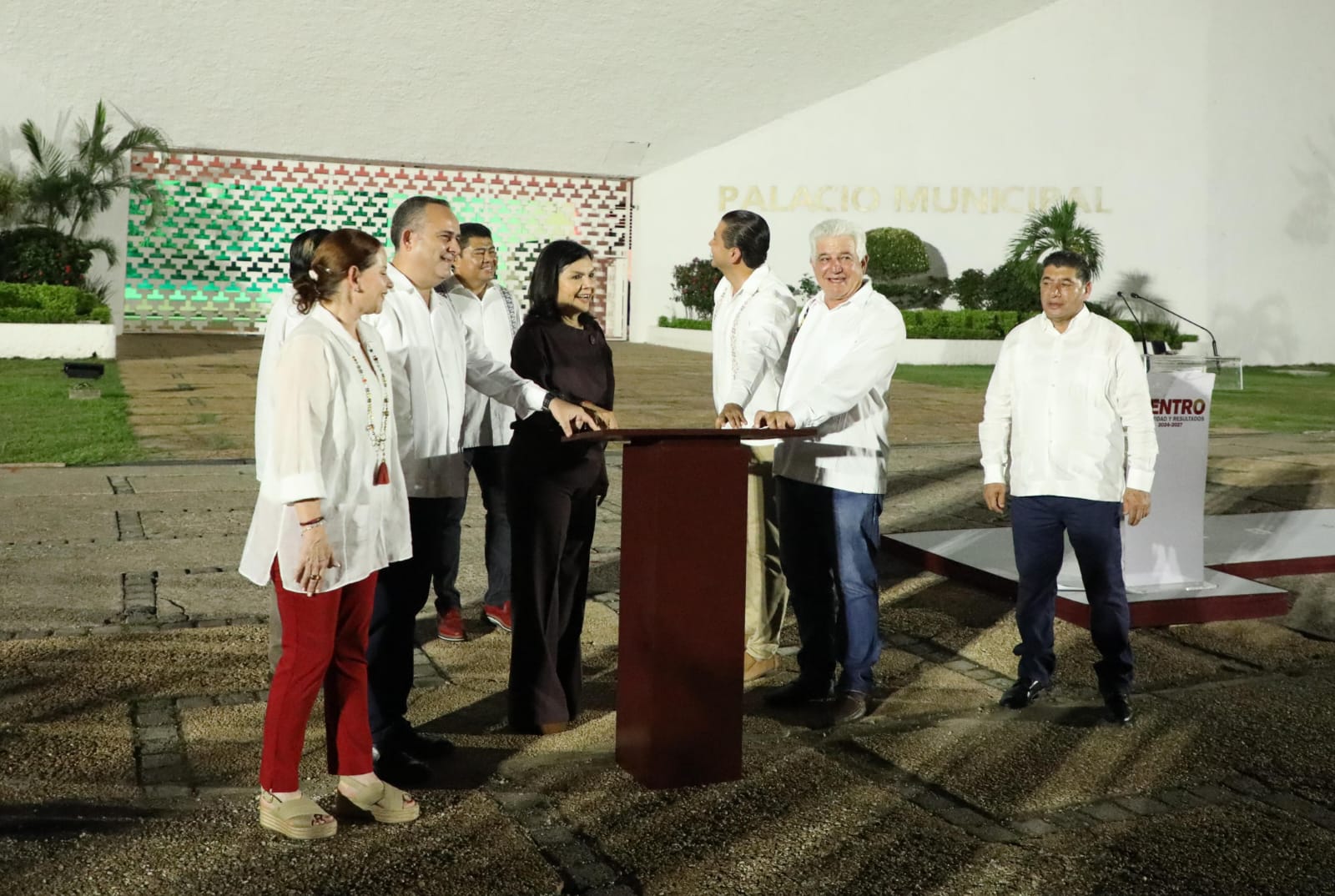 Las autoridades de los tres poderes del estado también acompañaron a la alcaldesa Yolanda Osuna, en la Plaza de la Revolución, al encendido de luces decorativas con motivo de las Fiestas Patrias, que fueron instaladas por el Ayuntamiento de Centro en las principales calles, cruces y avenidas de Villahermosa, así como en espacios públicos emblemáticos como el Palacio Municipal.
