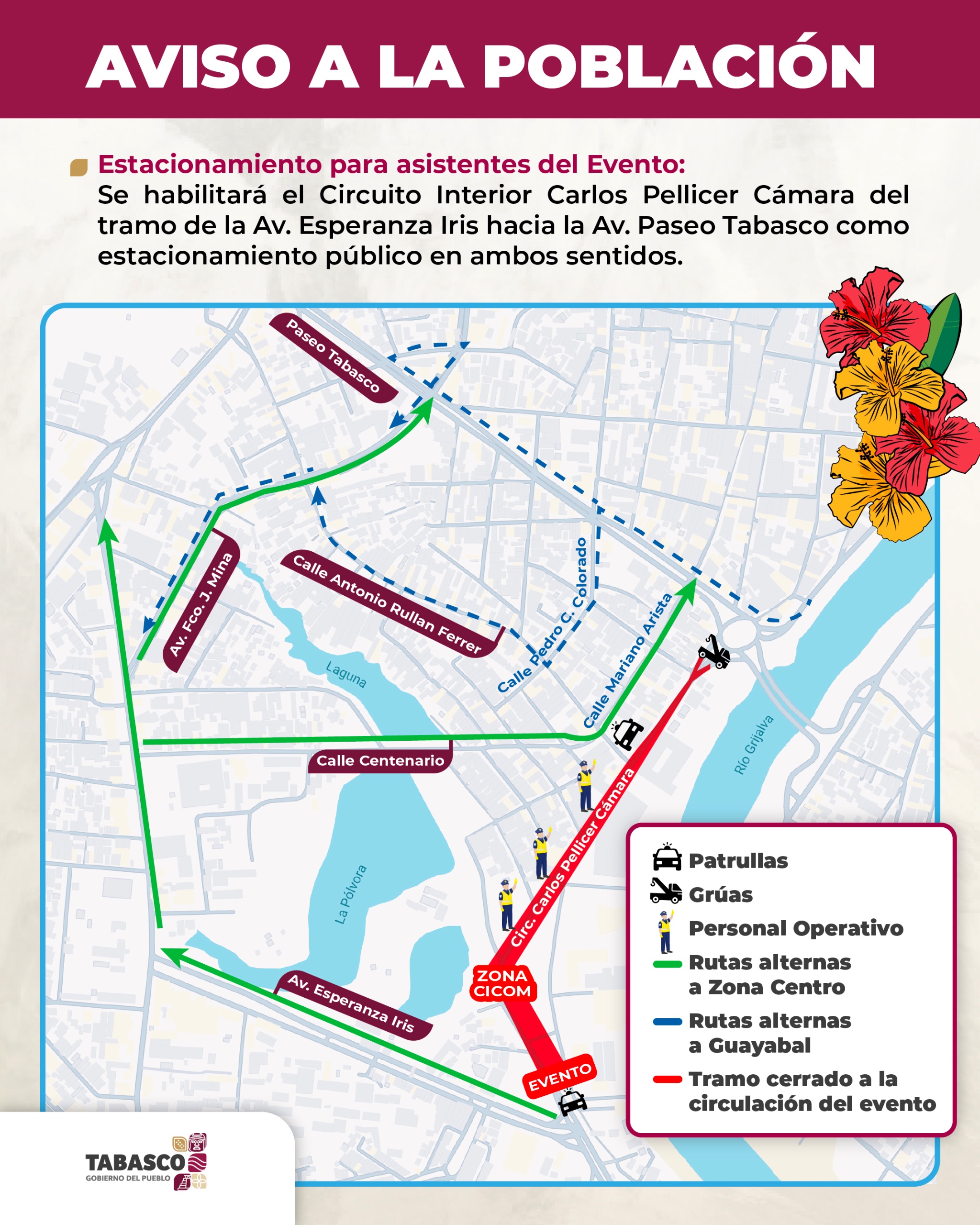 Con motivo de los eventos del Festival Cultural Ceiba 2025 que se llevarán cabo el sábado 18 de octubre en el teatro “Esperanza Iris” y el Foro Río Beats, el cual estará habilitado en la Zona CICOM, la Policía Estatal de Caminos (PEC) implementará un operativo vial que implicará el cierre a la circulación vehicular del tramo que va de la intersección del periférico Carlos Pellicer Cámara y avenida Esperanza Iris hasta la esquina de Paseo Tabasco y malecón Carlos A. Madrazo.