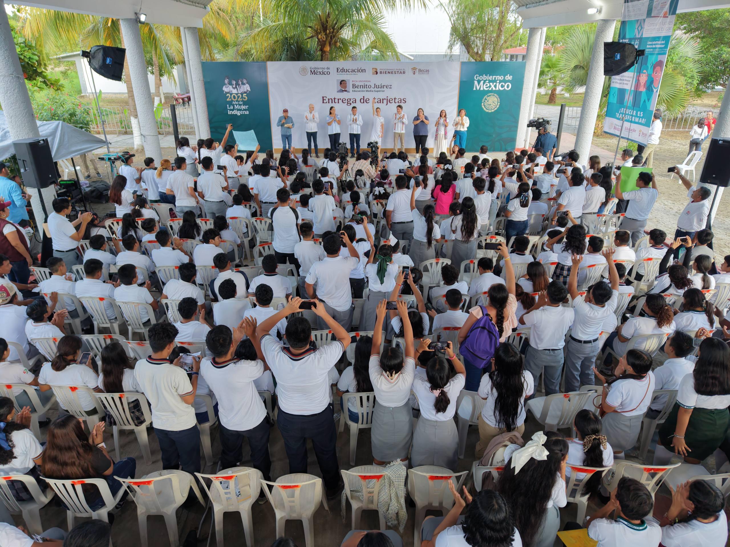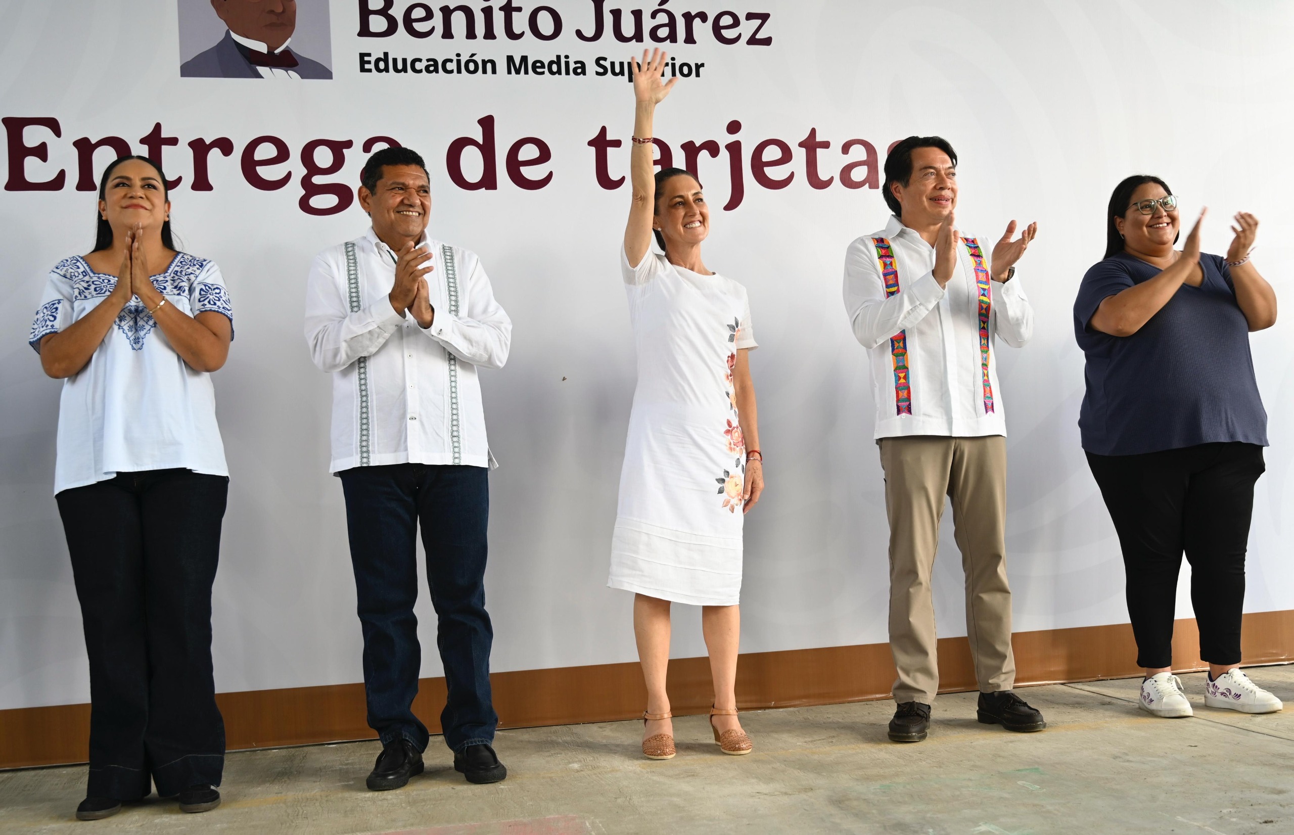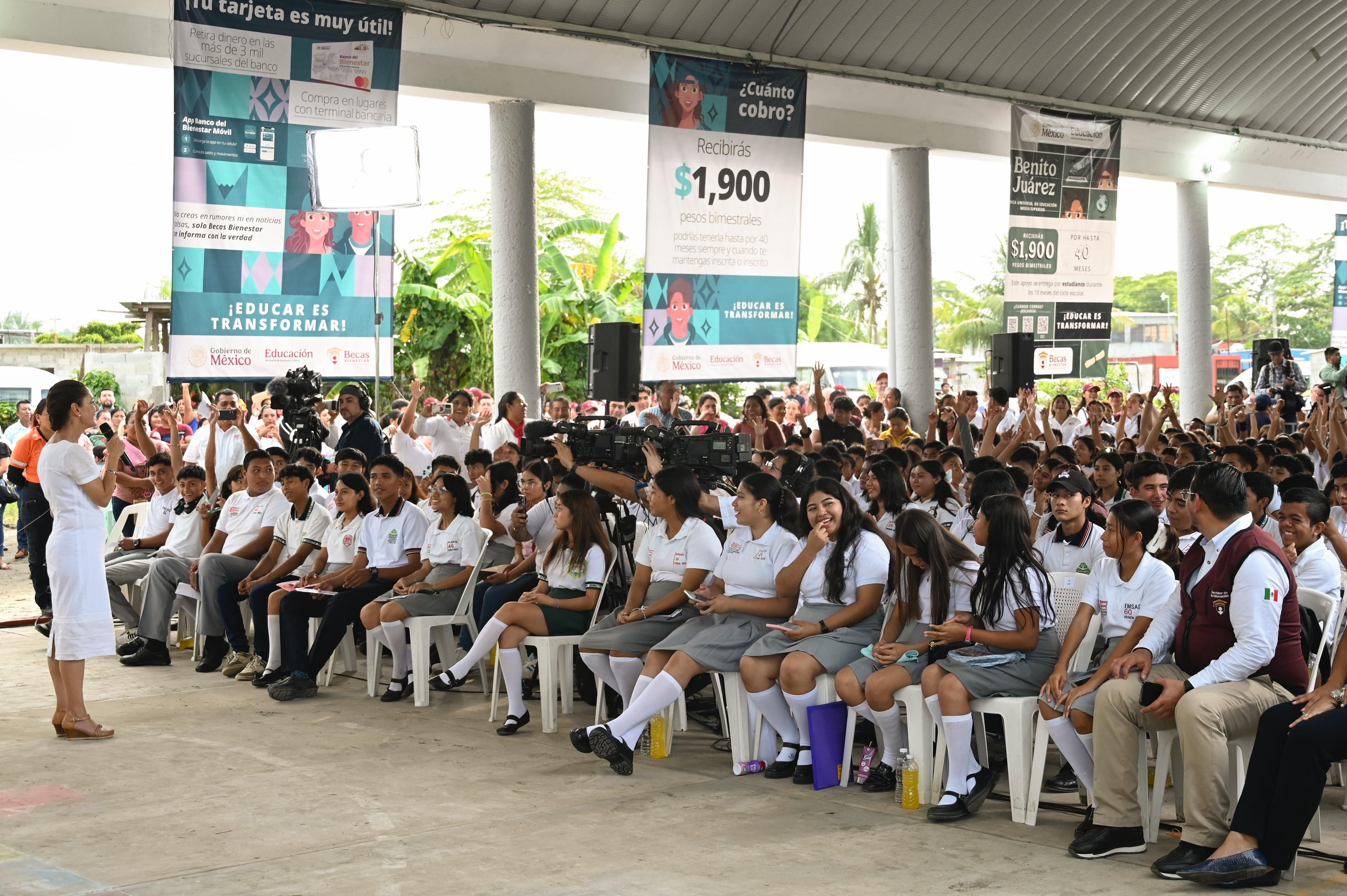“Lo más importante es que haya educación, que haya lugares para que los jóvenes puedan estudiar. No se hubiera hecho viral esa canción si no fuera una necesidad en nuestro país. Por eso, no solo vamos a construir más preparatorias que queden cerca de la casa, sino que vamos a construir más universidades que queden cerca de la casa para que saliendo de la preparatoria se vayan directito a la universidad”, resaltó luego de encabezar la entrega de tarjetas del Banco del Bienestar a estudiantes del Colegio de Bachilleres No. 46 beneficiarios de la beca Benito Juárez García.