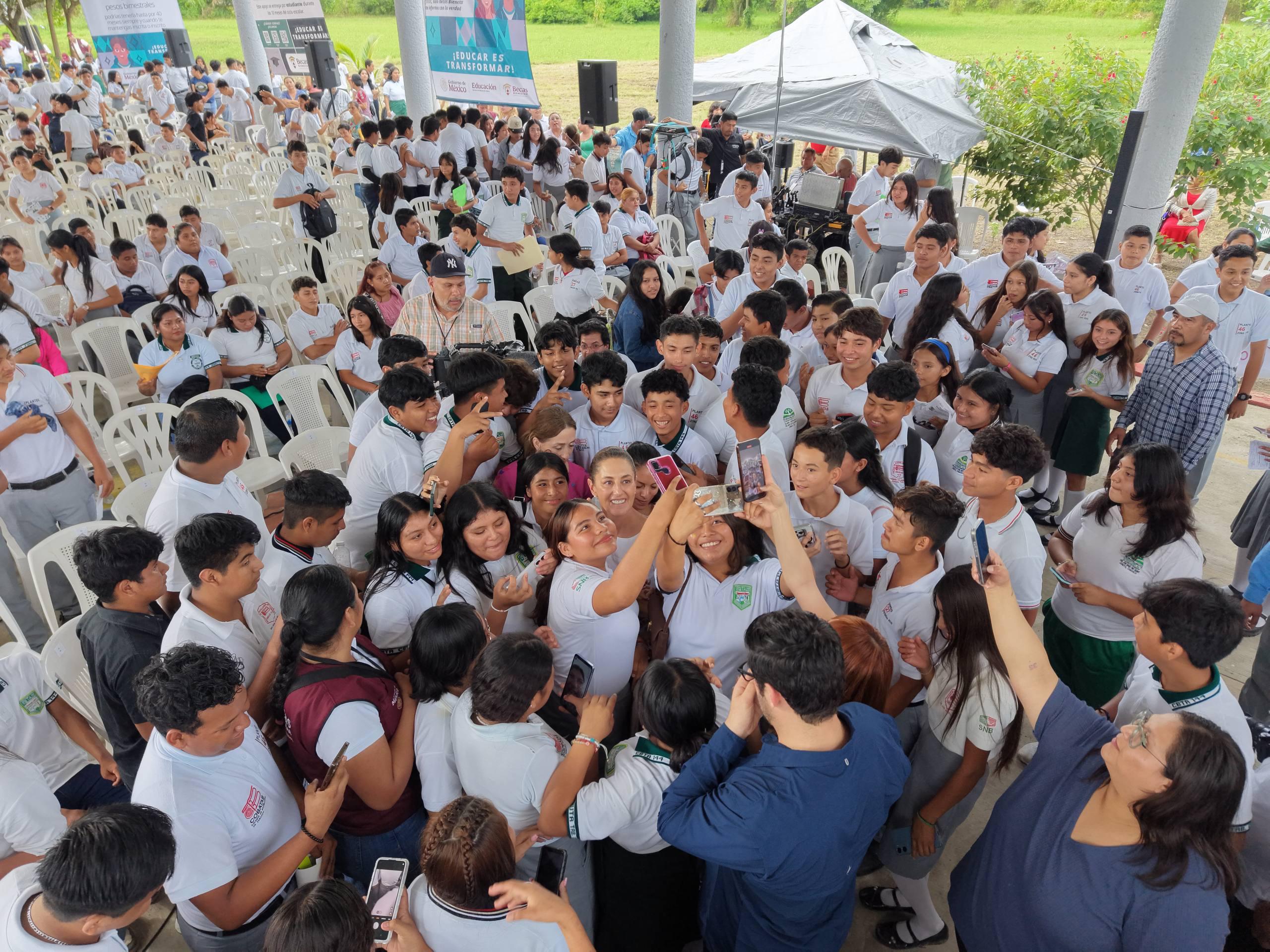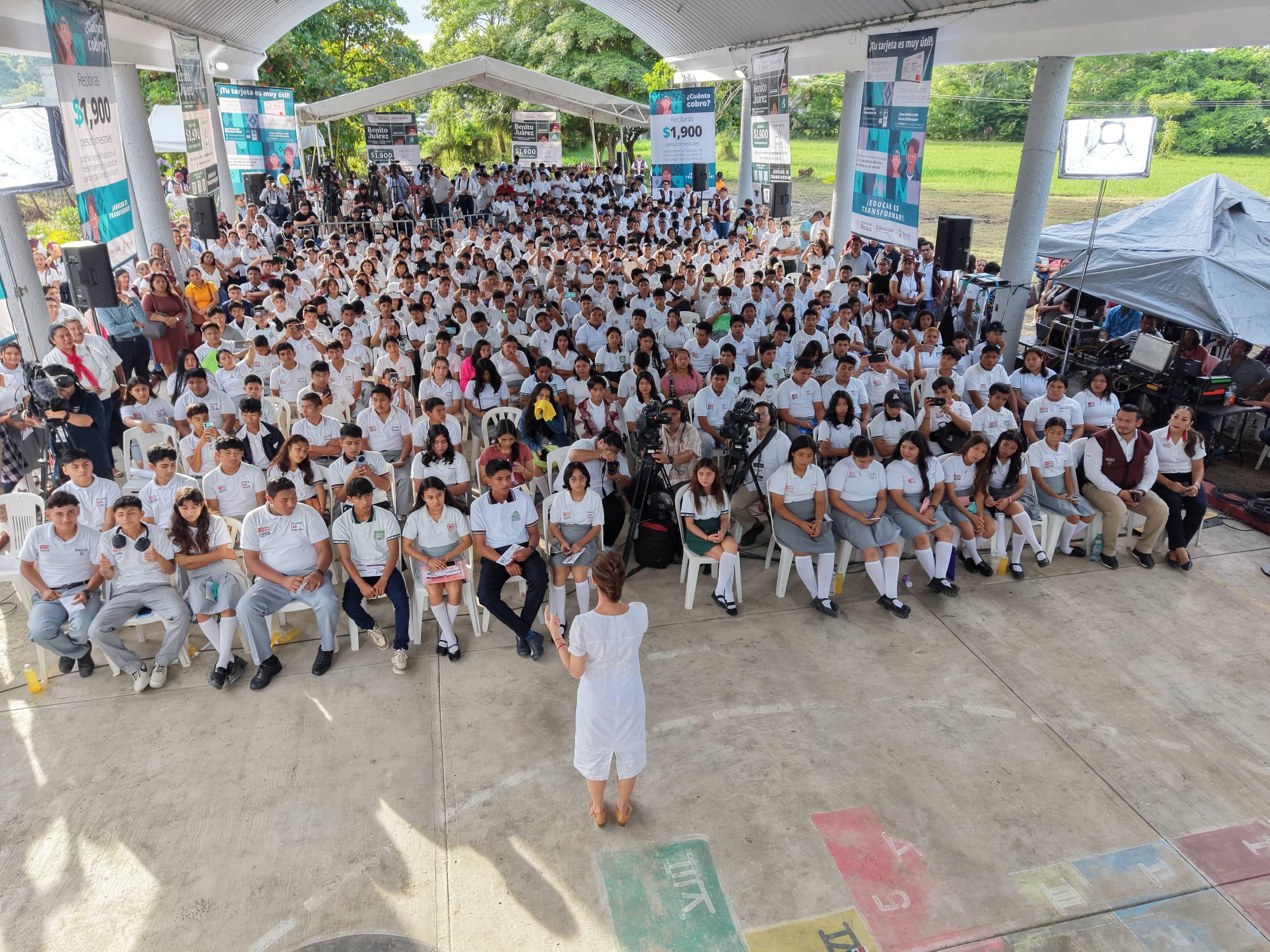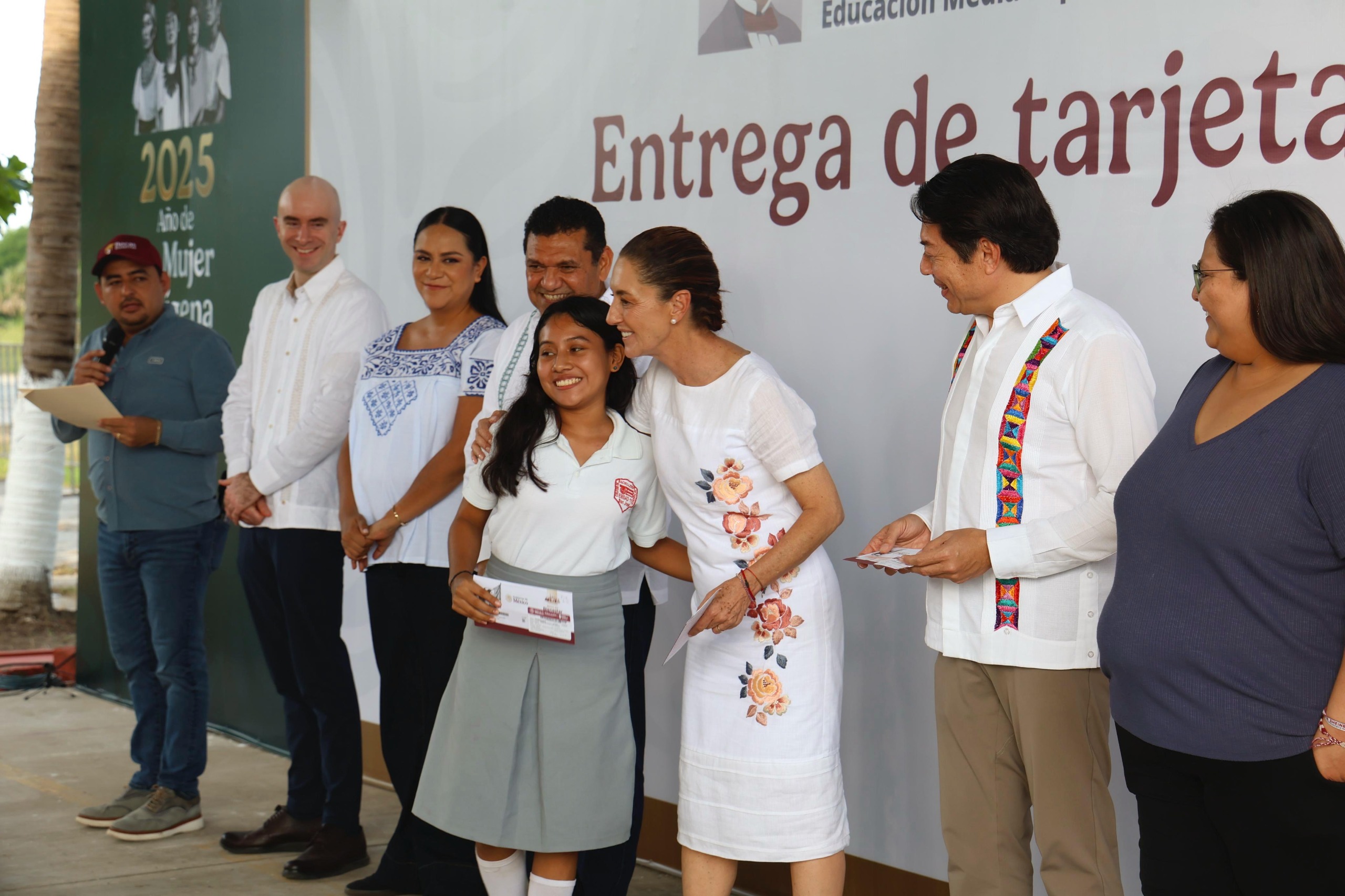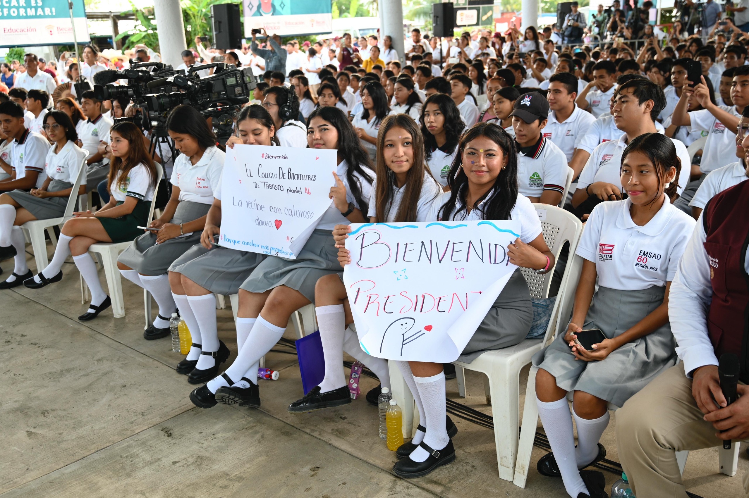 “Lo más importante es que haya educación, que haya lugares para que los jóvenes puedan estudiar. No se hubiera hecho viral esa canción si no fuera una necesidad en nuestro país. Por eso, no solo vamos a construir más preparatorias que queden cerca de la casa, sino que vamos a construir más universidades que queden cerca de la casa para que saliendo de la preparatoria se vayan directito a la universidad”, resaltó luego de encabezar la entrega de tarjetas del Banco del Bienestar a estudiantes del Colegio de Bachilleres No. 46 beneficiarios de la beca Benito Juárez García.